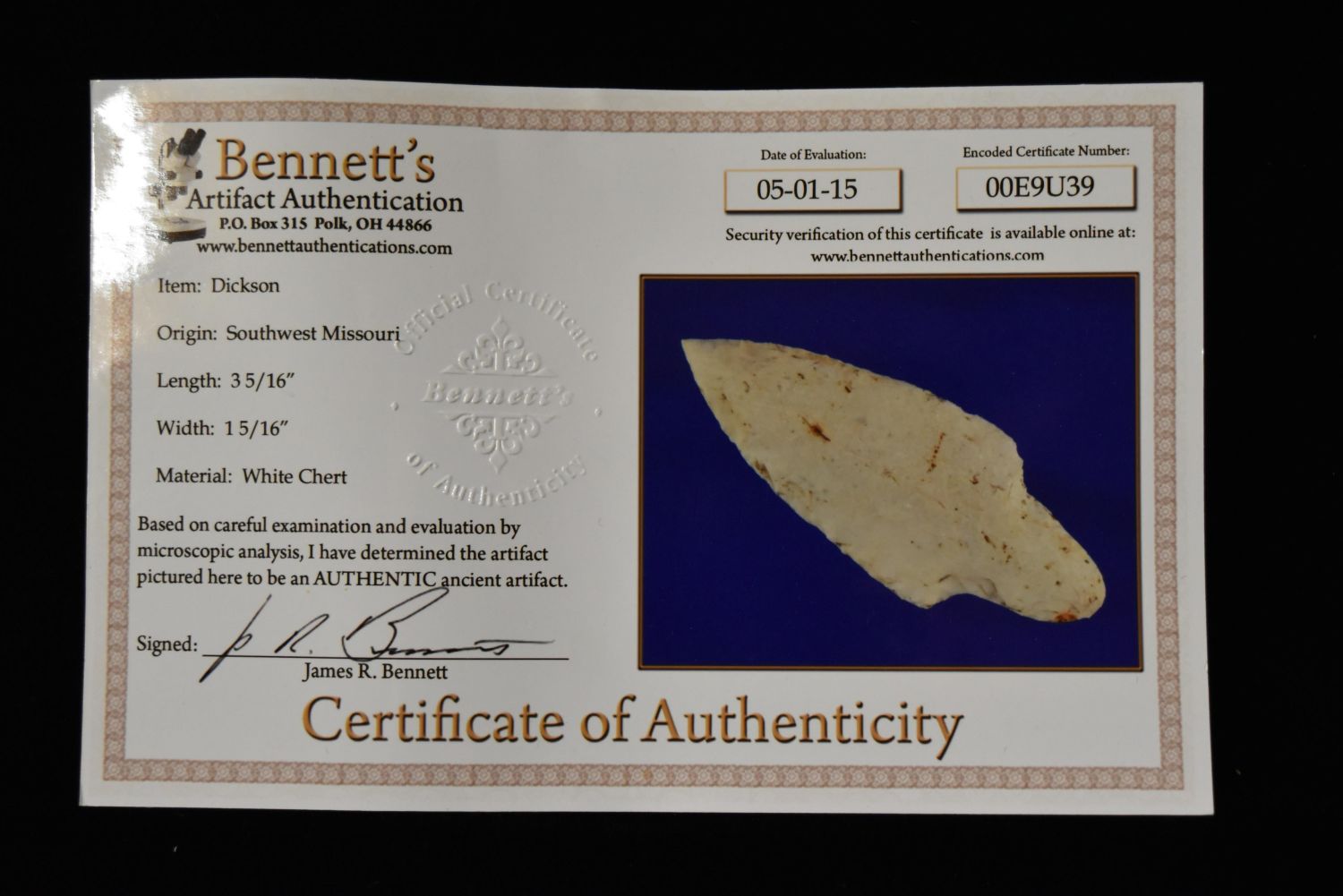 3 5/16" Dickson Point, Bennett COA, Southwest Missouri Condition: 100% Guaranteed Authentic via our Return Policy & Found on Private Property