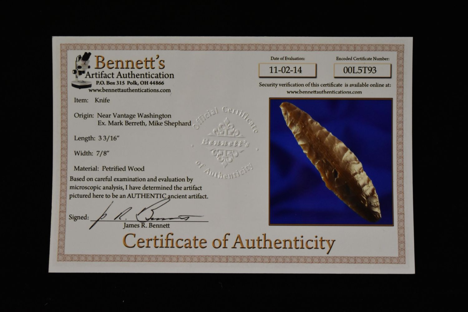 3 3/16" Petrified Wood Blade, Bennett COA, Washington, Ex Mark Berreth, Mike Shephard