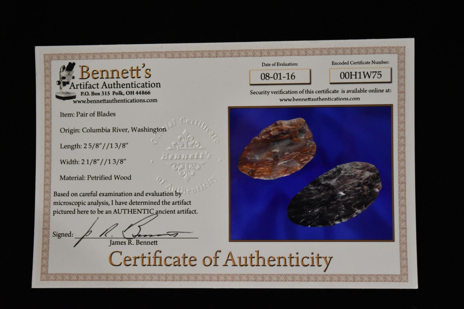 2 5/8" Petrified Wood Blade, Bennett COA, Stermer COA,