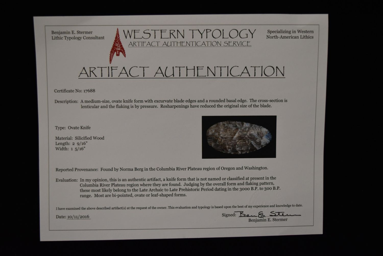 2 5/8" Petrified Wood Blade, Bennett COA, Stermer COA, Columbia River, Washington, FB Norma Berg