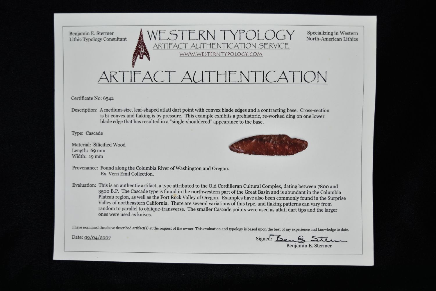 2 3/4" Cascade Point, Stermer COA, Petrified Wood, Columbia River, Washington, Ex Vern Emil Collection