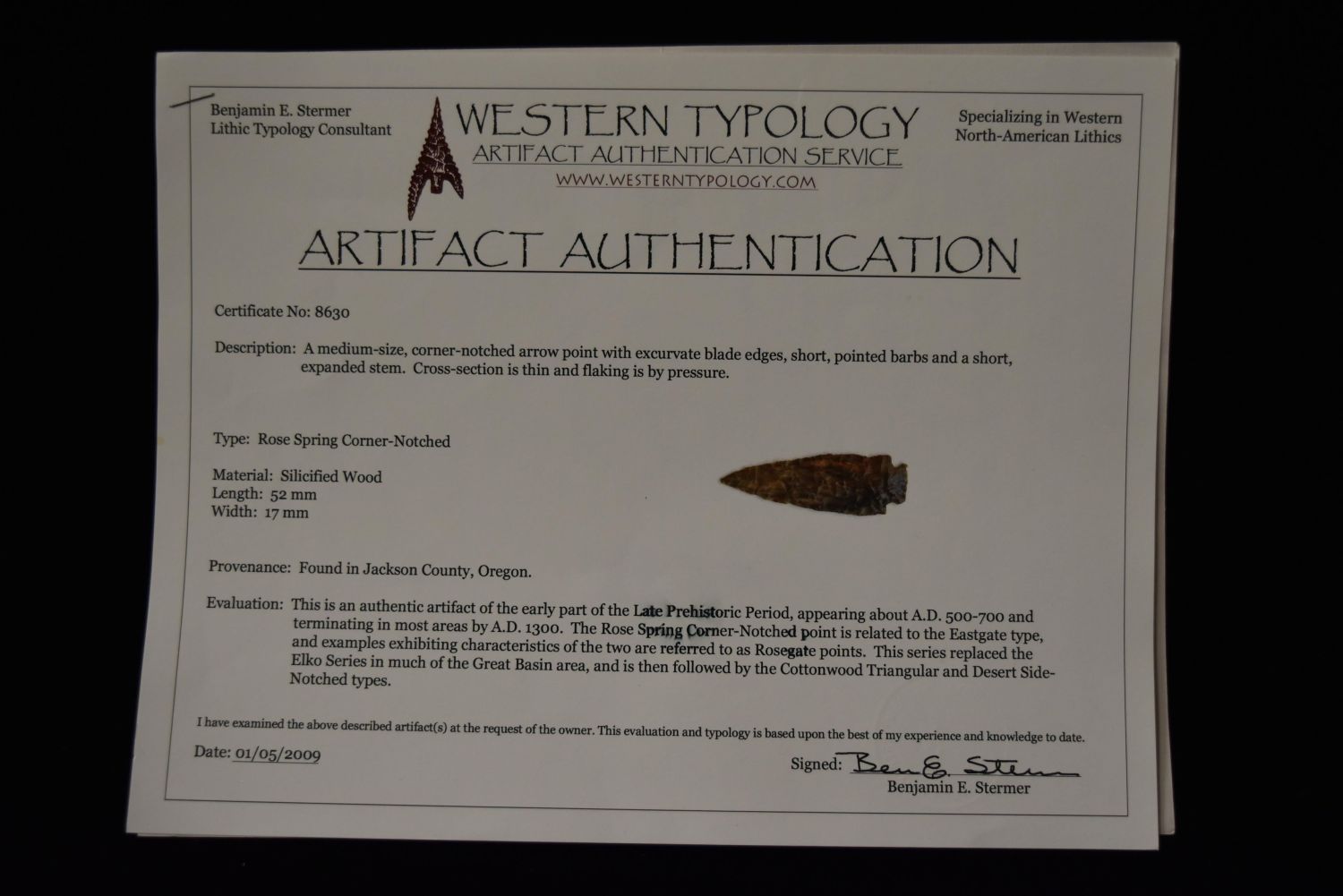 2 1/8" Petrified Wood Rose Spring Corner Notch Point, Stermer COA, Jackson Co, Oregon Condition: 100% Guaranteed Authentic via our Return Policy & Found on Private Property