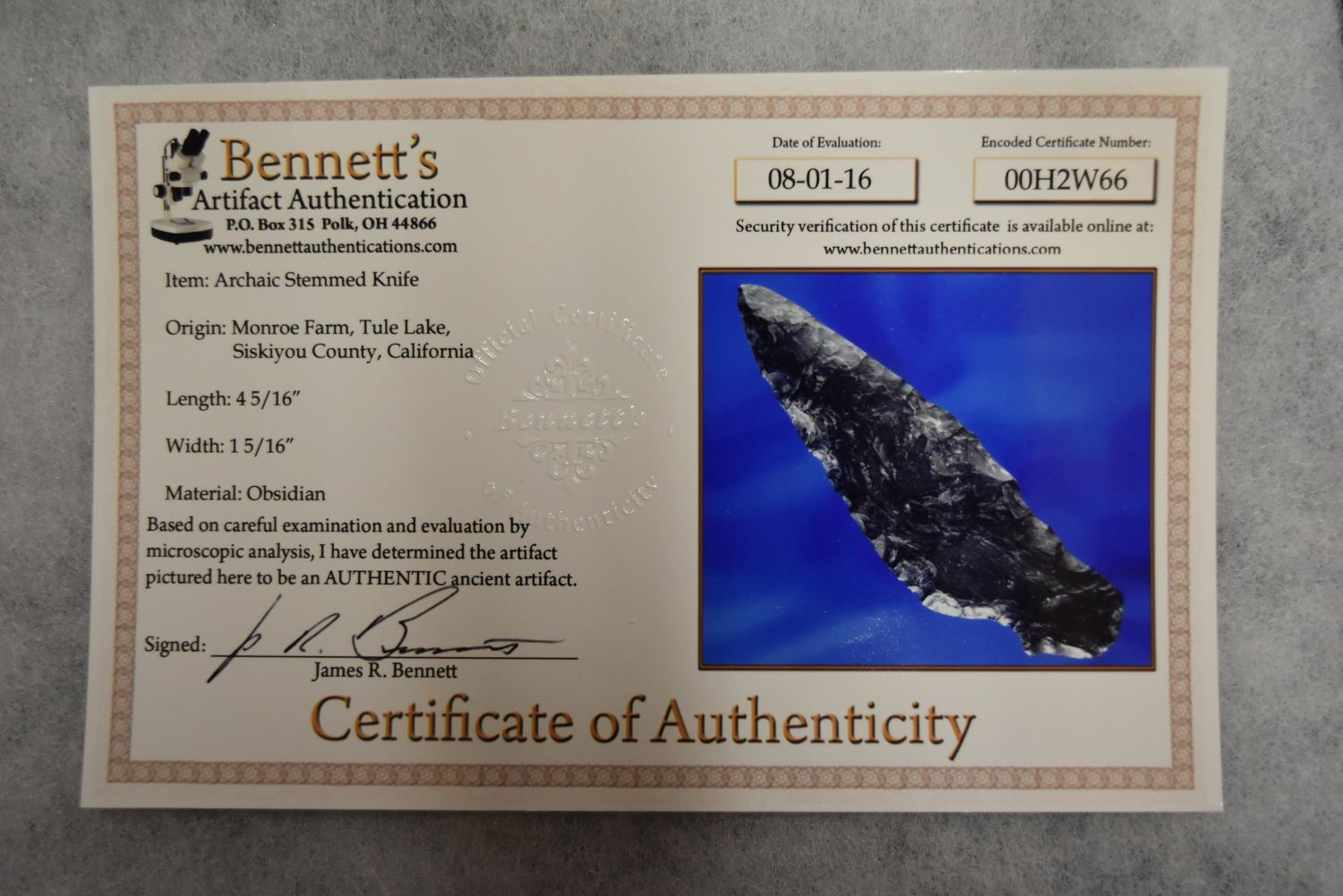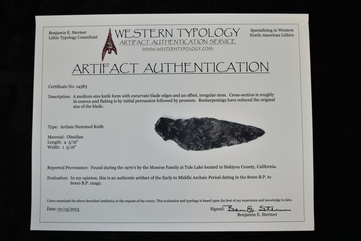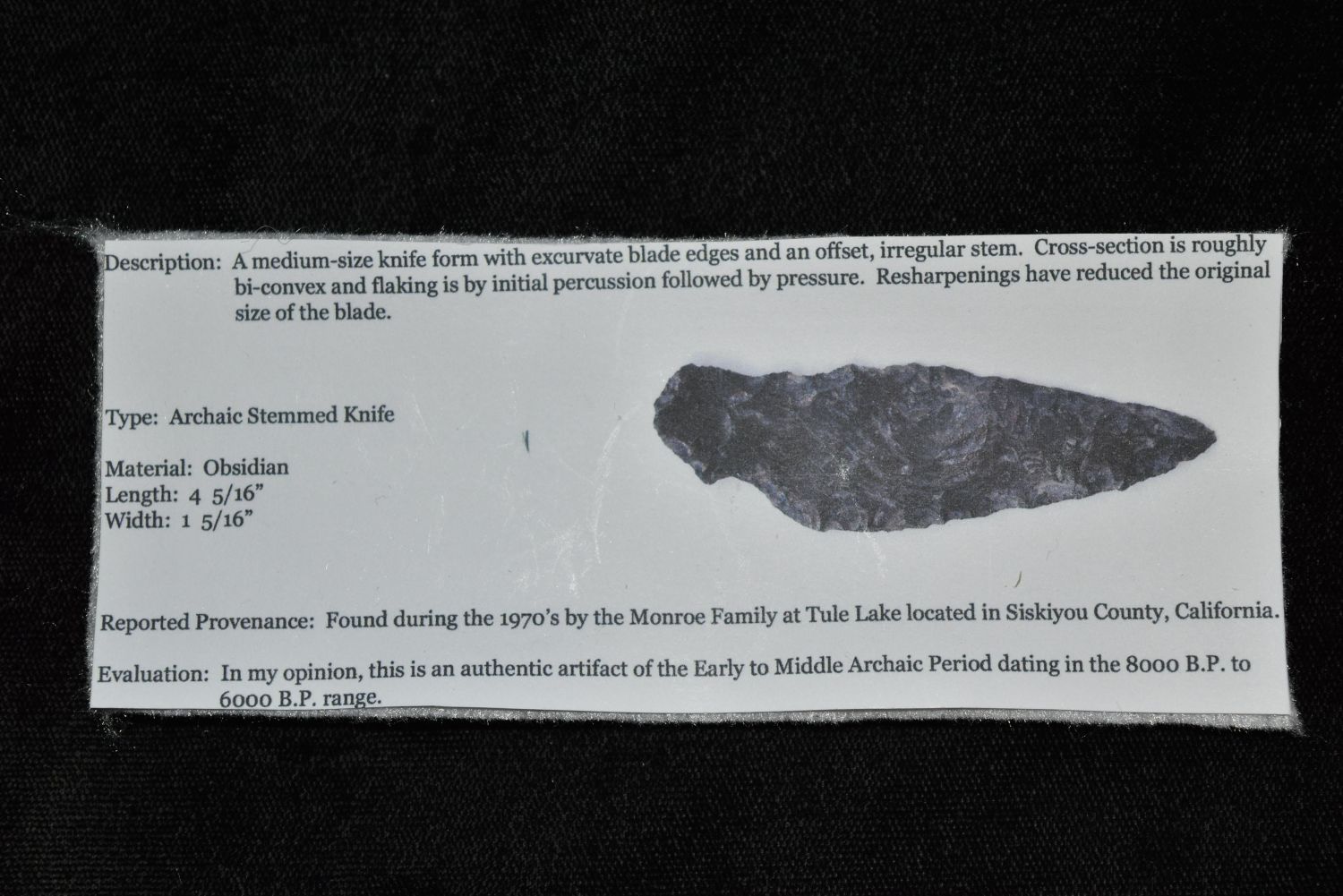 4 5/16" Obsidian Archaic Stemmed Knife, Bennett COA, Stermer COA, Siskiyou Co, California Condition: 100% Guaranteed Authentic via our Return Policy & Found on Private Property