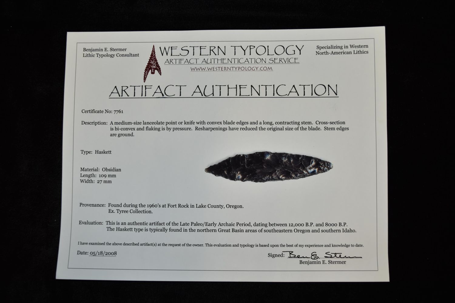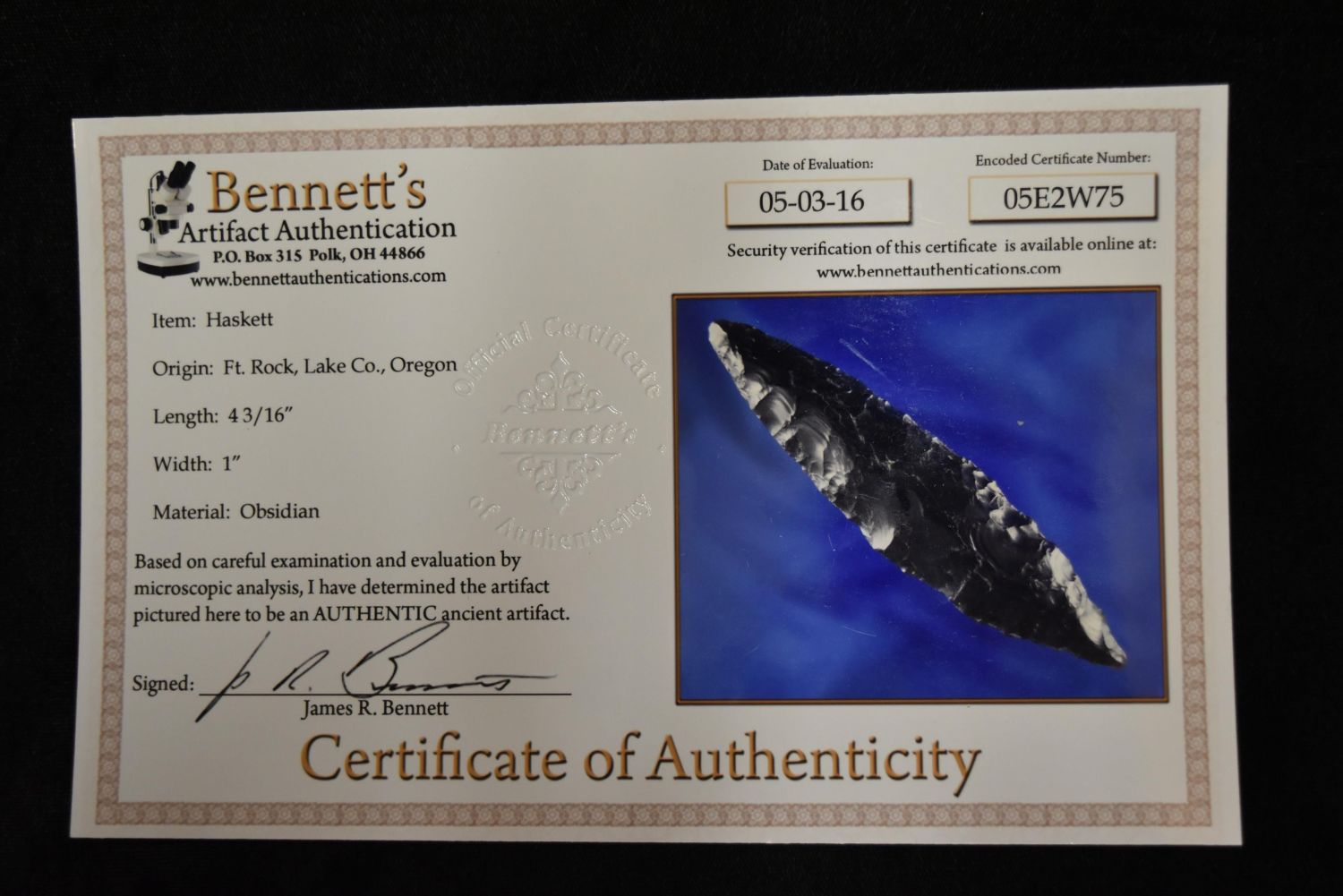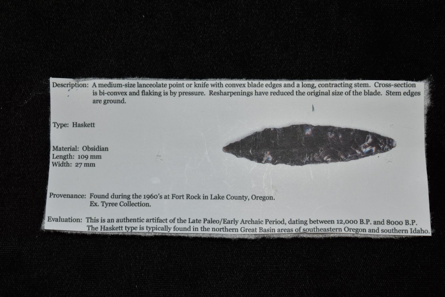 4 3/16" Obsidian Haskett Point, Bennett COA, Stermer COA, Lake Co, Oregon Condition: 100% Guaranteed Authentic via our Return Policy & Found on Private Property