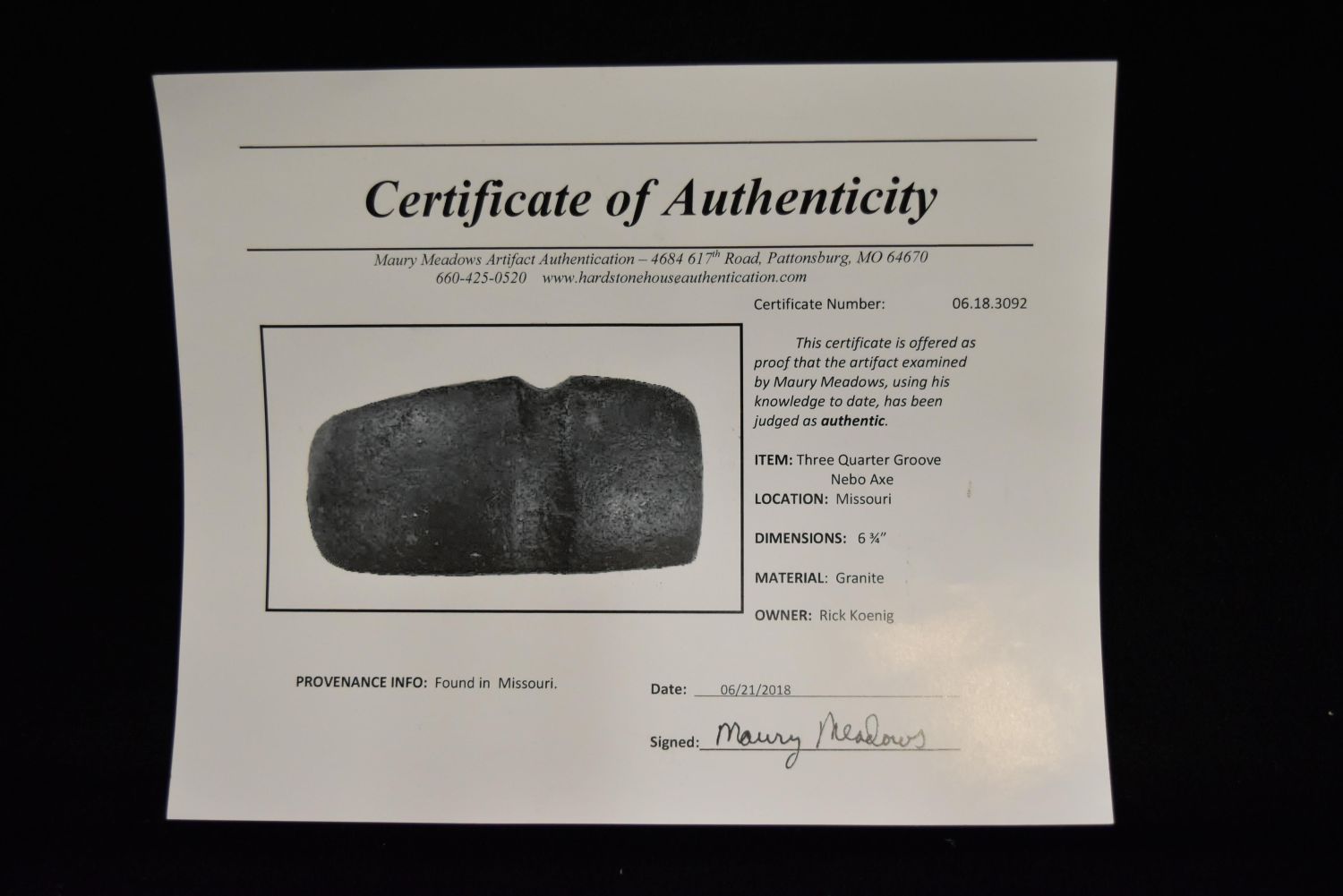 6 3/4" 3/4 Groove Nebo Axe, Meadows COA, Missouri Condition: 100% Guaranteed Authentic via our Return Policy & Found on Private Property