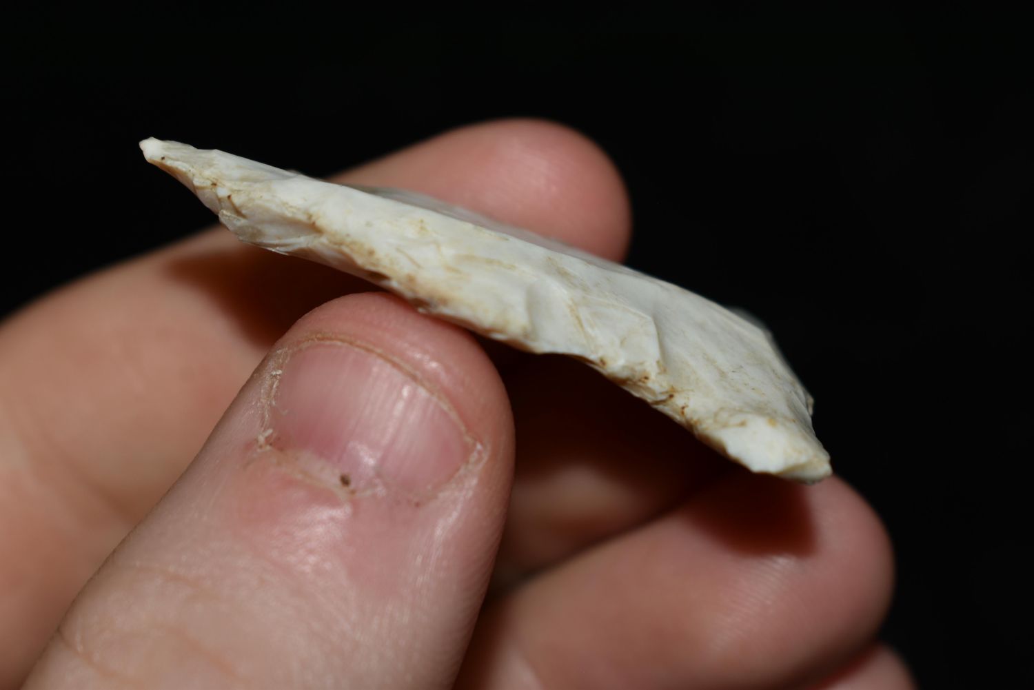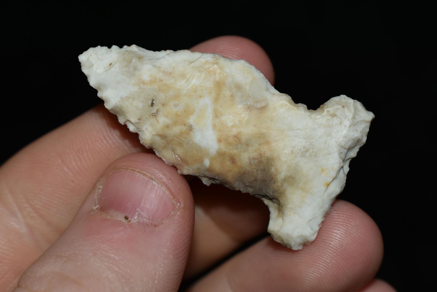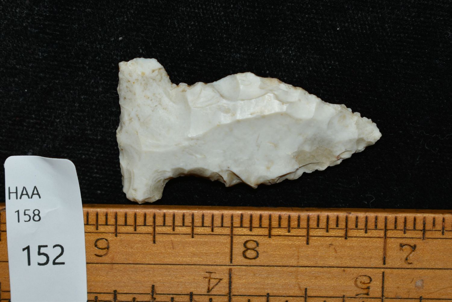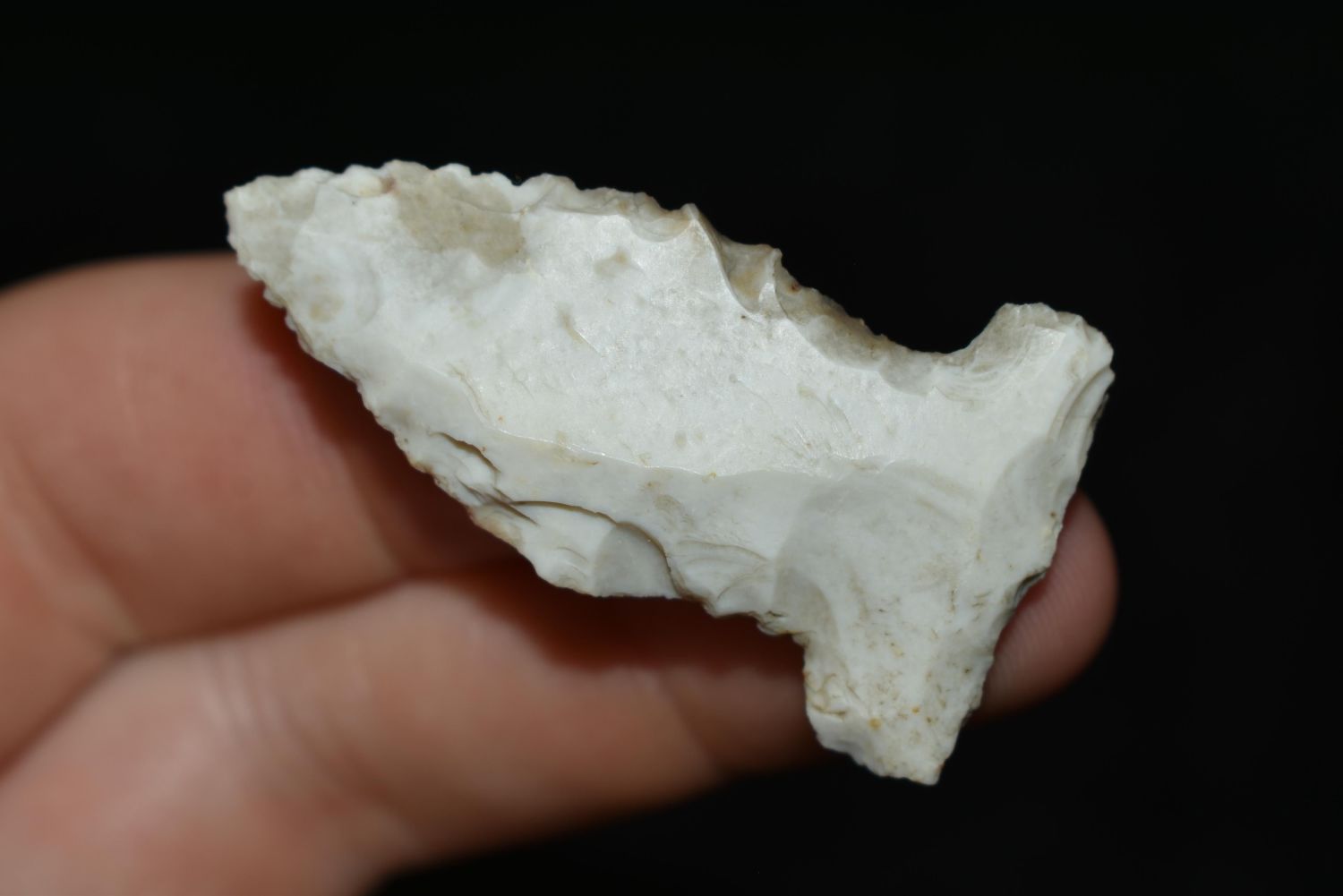 1 5/8" Mississpian Side Notched, This collection contains the personally found relics of Steve Koch, Winchester Illinois. Steve hunted relics his entire life with family and friends. He mainly hunted in the Scott Co., Illinois area, and the majority of his finds came from the Illinois River Valley. This is the first 300+- lots of this collection to be auction.