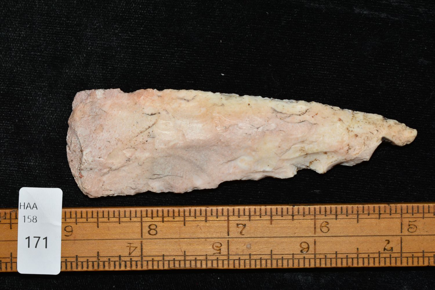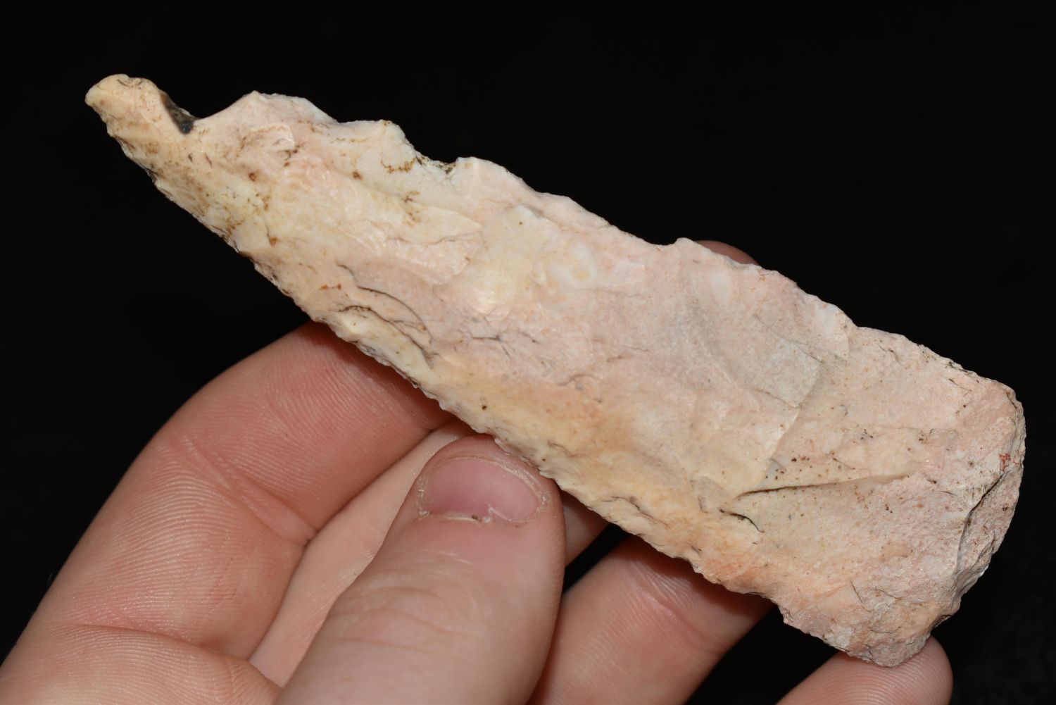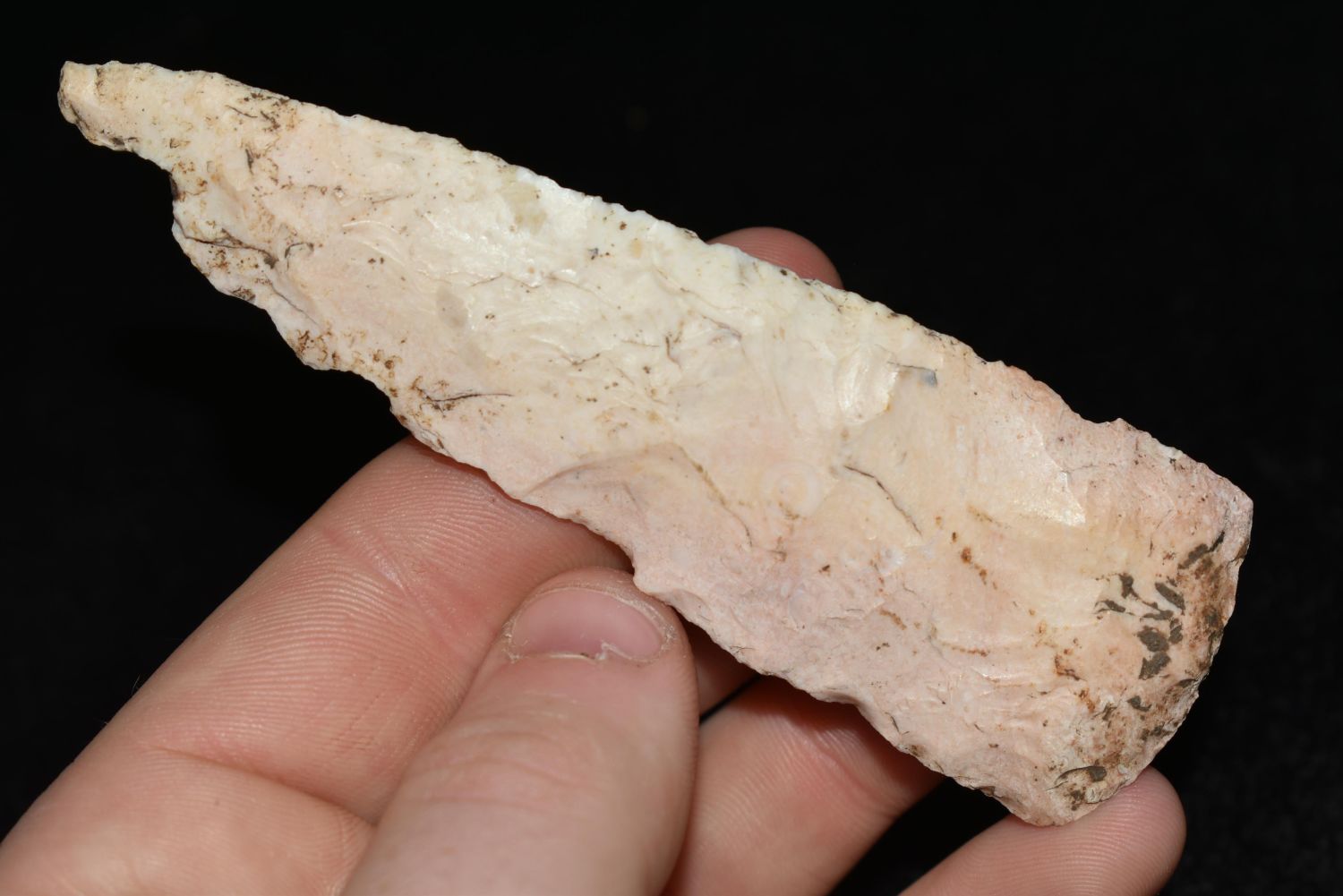 4" Hopewell Knife, This collection contains the personally found relics of Steve Koch, Winchester Illinois. Steve hunted relics his entire life with family and friends. He mainly hunted in the Scott Co., Illinois area, and the majority of his finds came from the Illinois River Valley. This is the first 300+- lots of this collection to be auction.