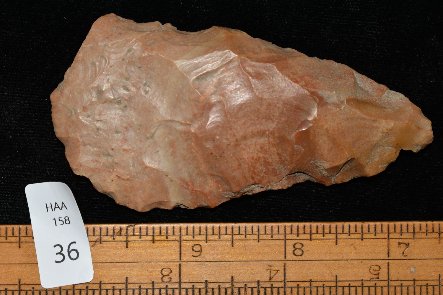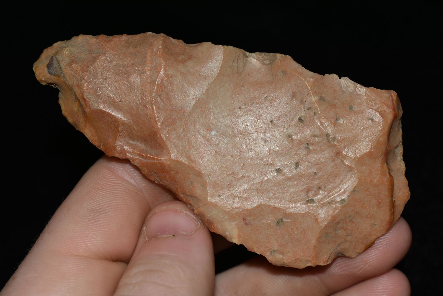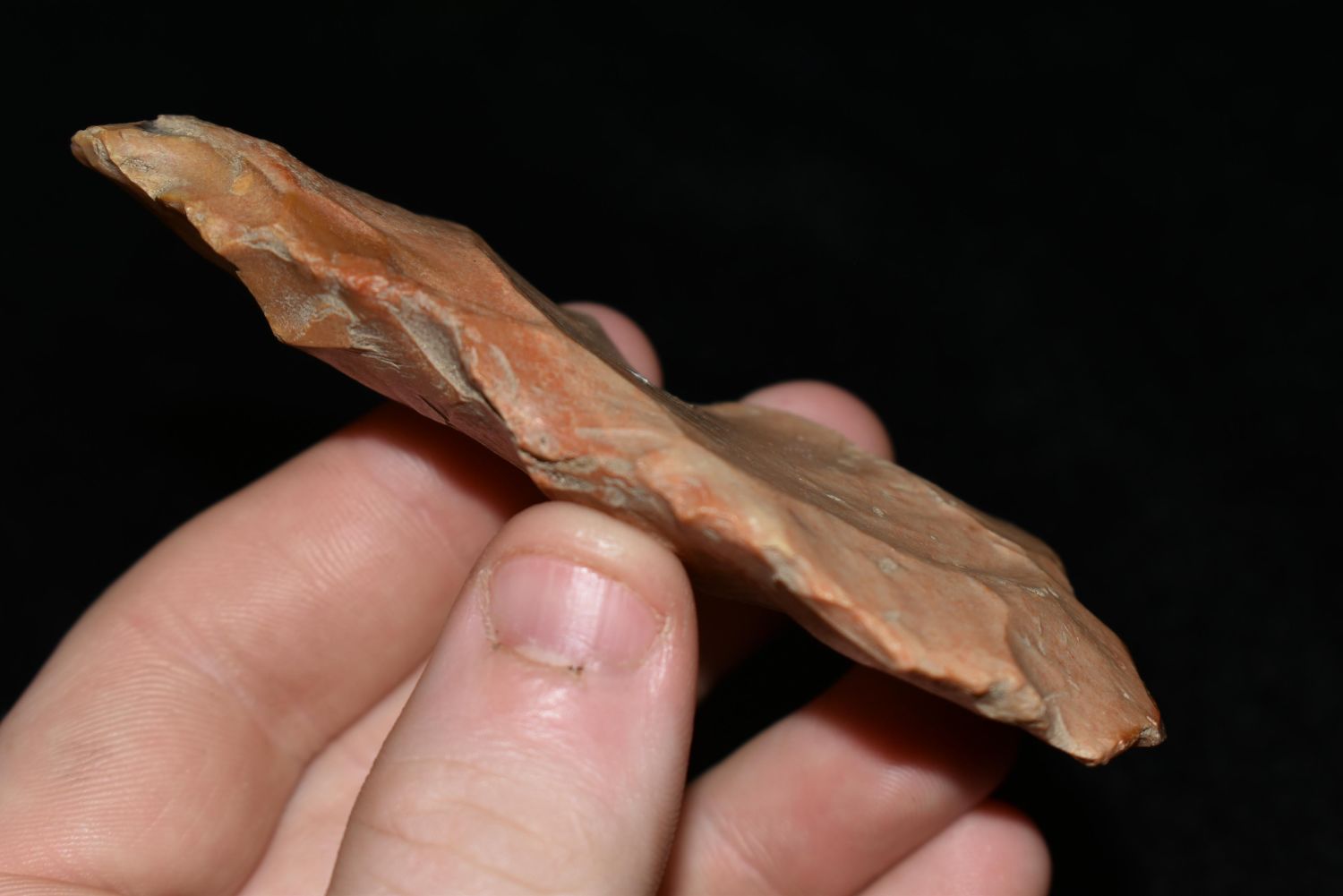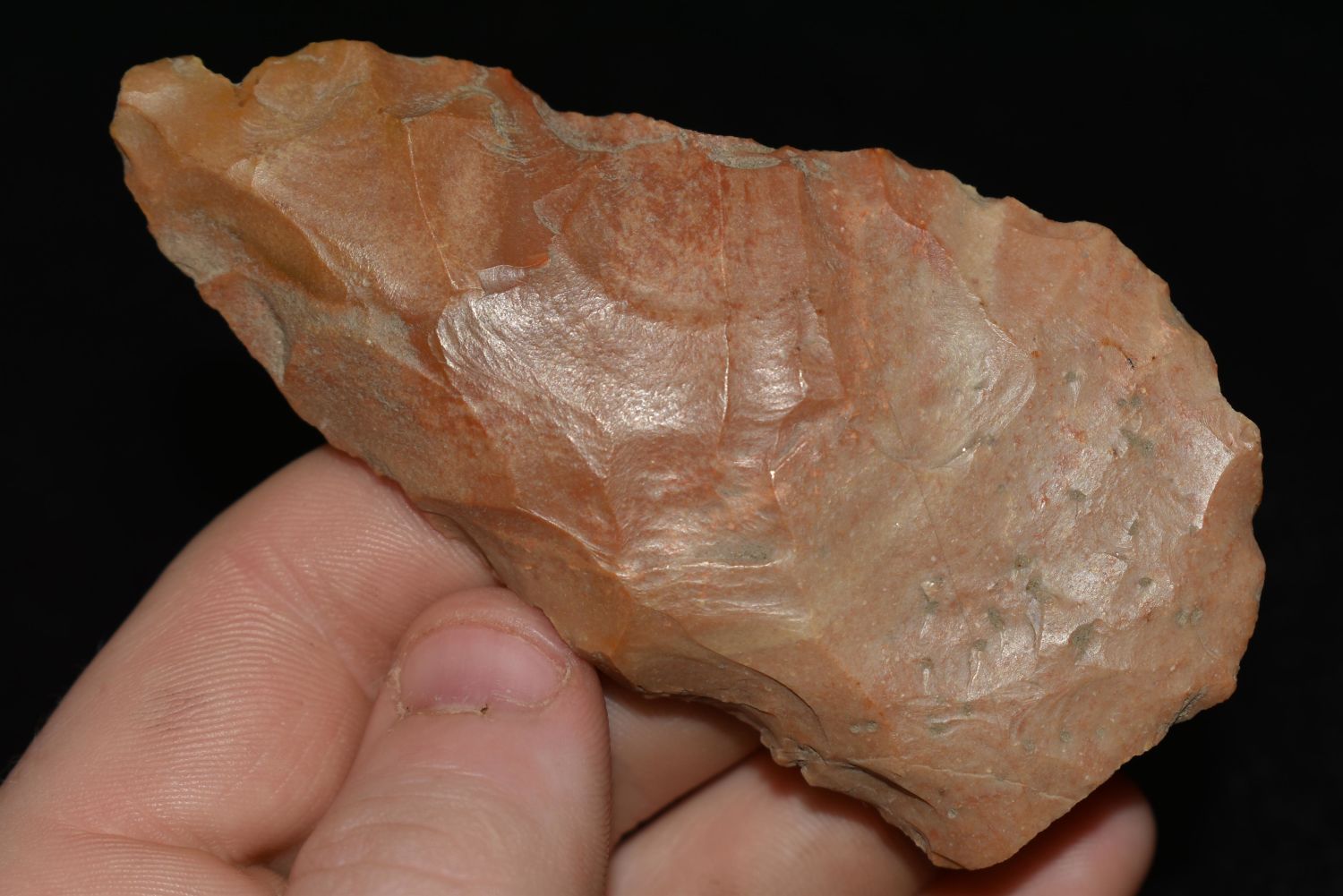 3 5/8" Payson Chert Cobbs Knife, This collection contains the personally found relics of Steve Koch, Winchester Illinois. Steve hunted relics his entire life with family and friends. He mainly hunted in the Scott Co., Illinois area, and the majority of his finds came from the Illinois River Valley. This is the first 300+- lots of this collection to be auction.