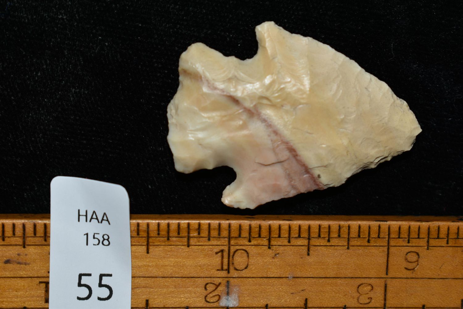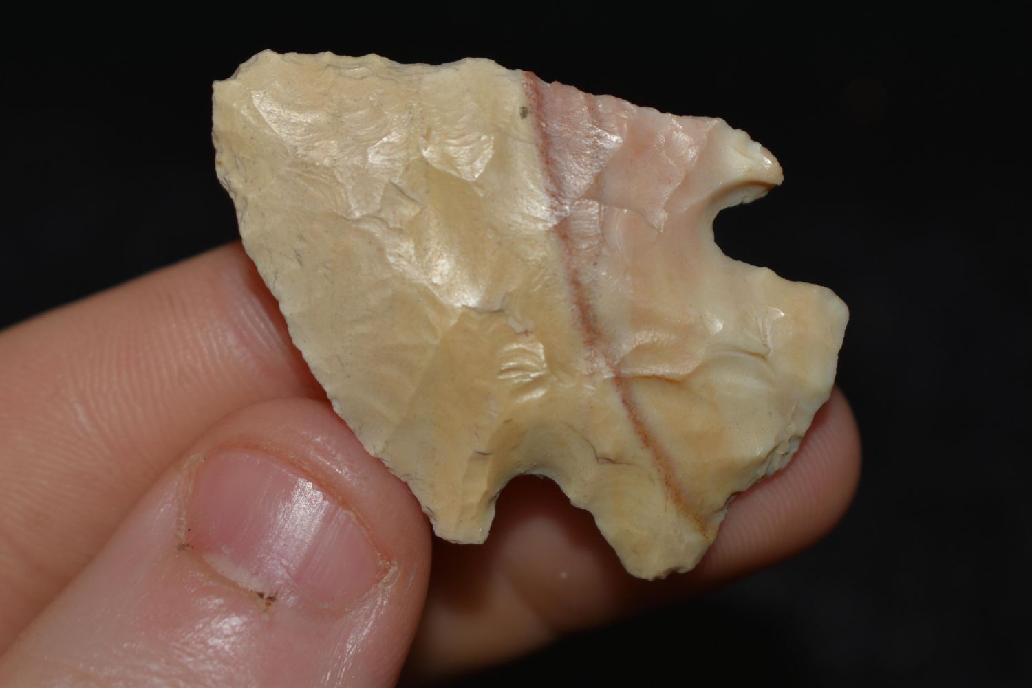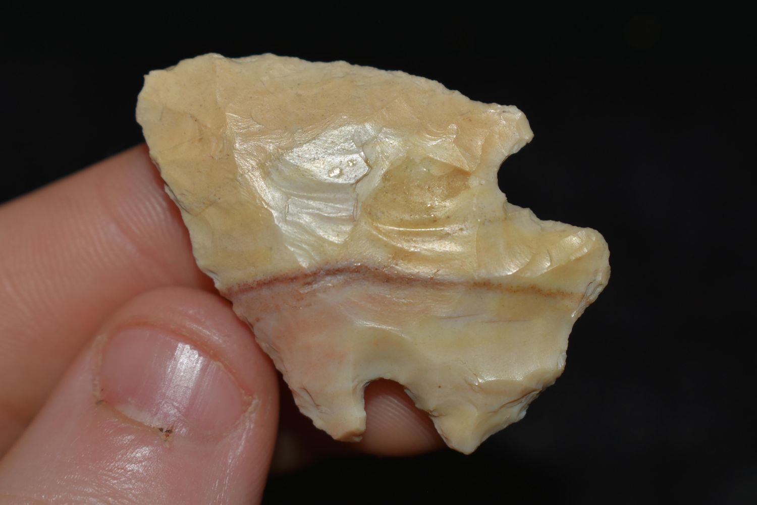 1 1/2" Corner Notch with Nice Red Stripe, This collection contains the personally found relics of Steve Koch, Winchester Illinois. Steve hunted relics his entire life with family and friends. He mainly hunted in the Scott Co., Illinois area, and the majority of his finds came from the Illinois River Valley. This is the first 300+- lots of this collection to be auction.