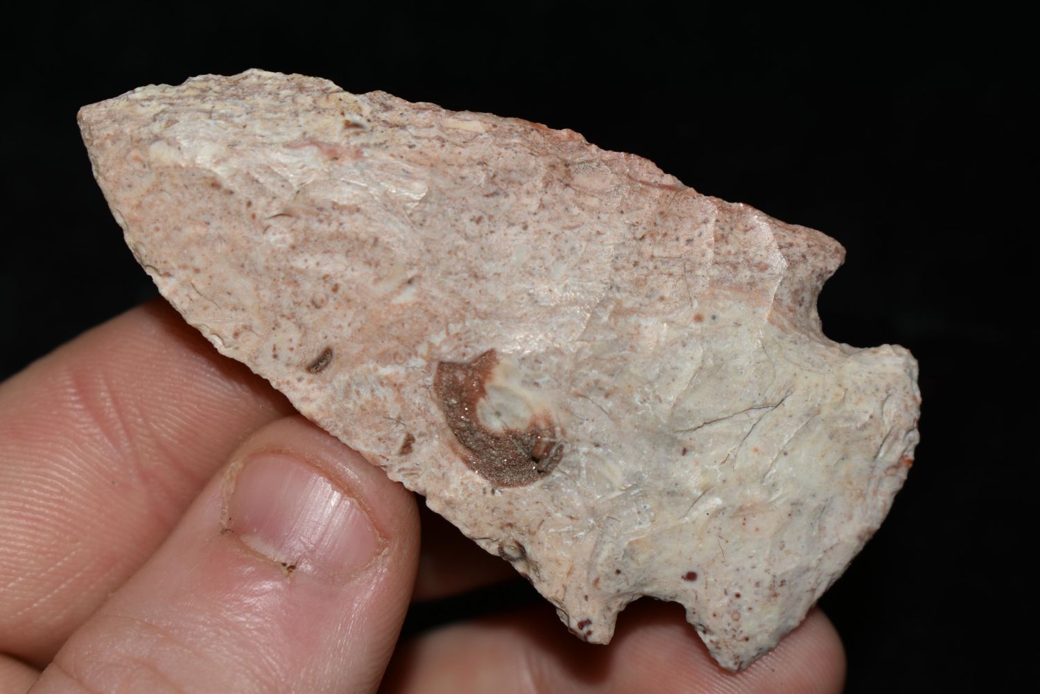 2 5/8" Gibson, Amazing Fossil Inclusion, This collection contains the personally found relics of Steve Koch, Winchester Illinois. Steve hunted relics his entire life with family and friends. He mainly hunted in the Scott Co., Illinois area, and the majority of his finds came from the Illinois River Valley. This is the first 300+- lots of this collection to be auction.