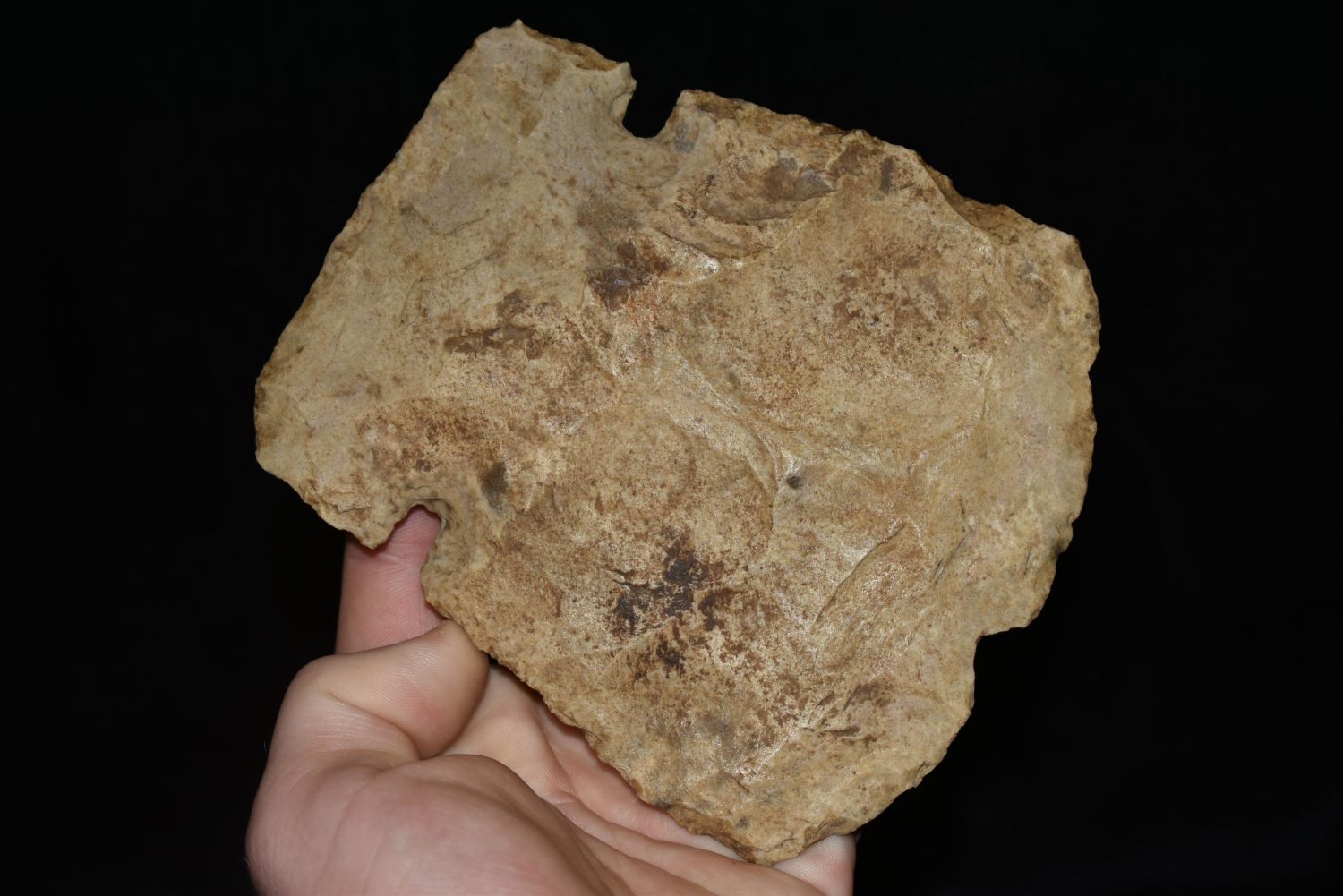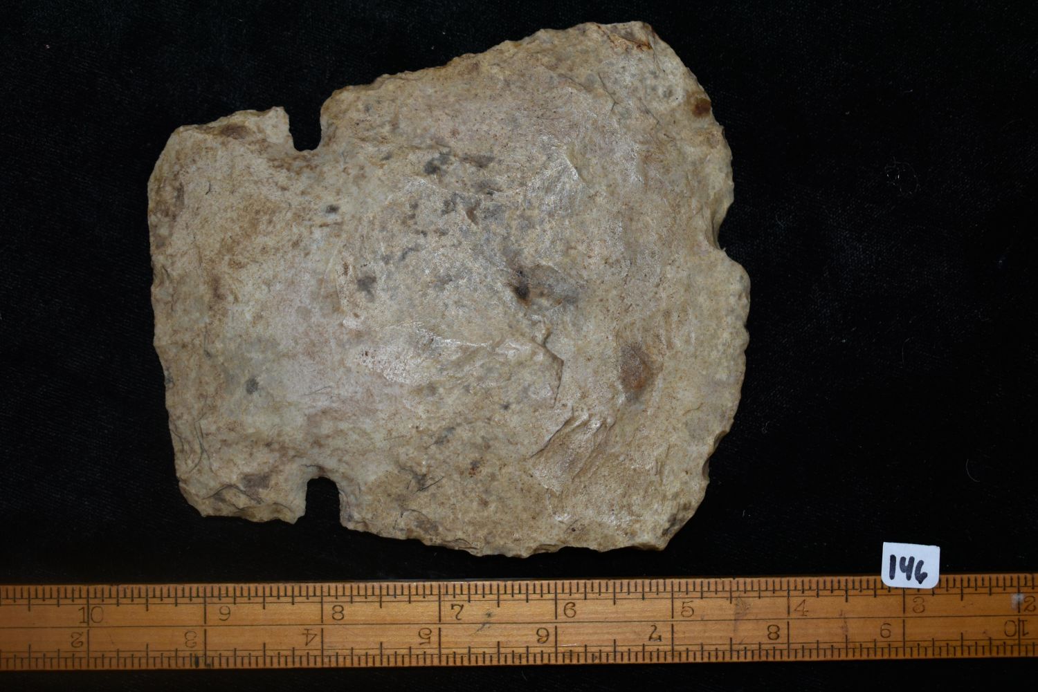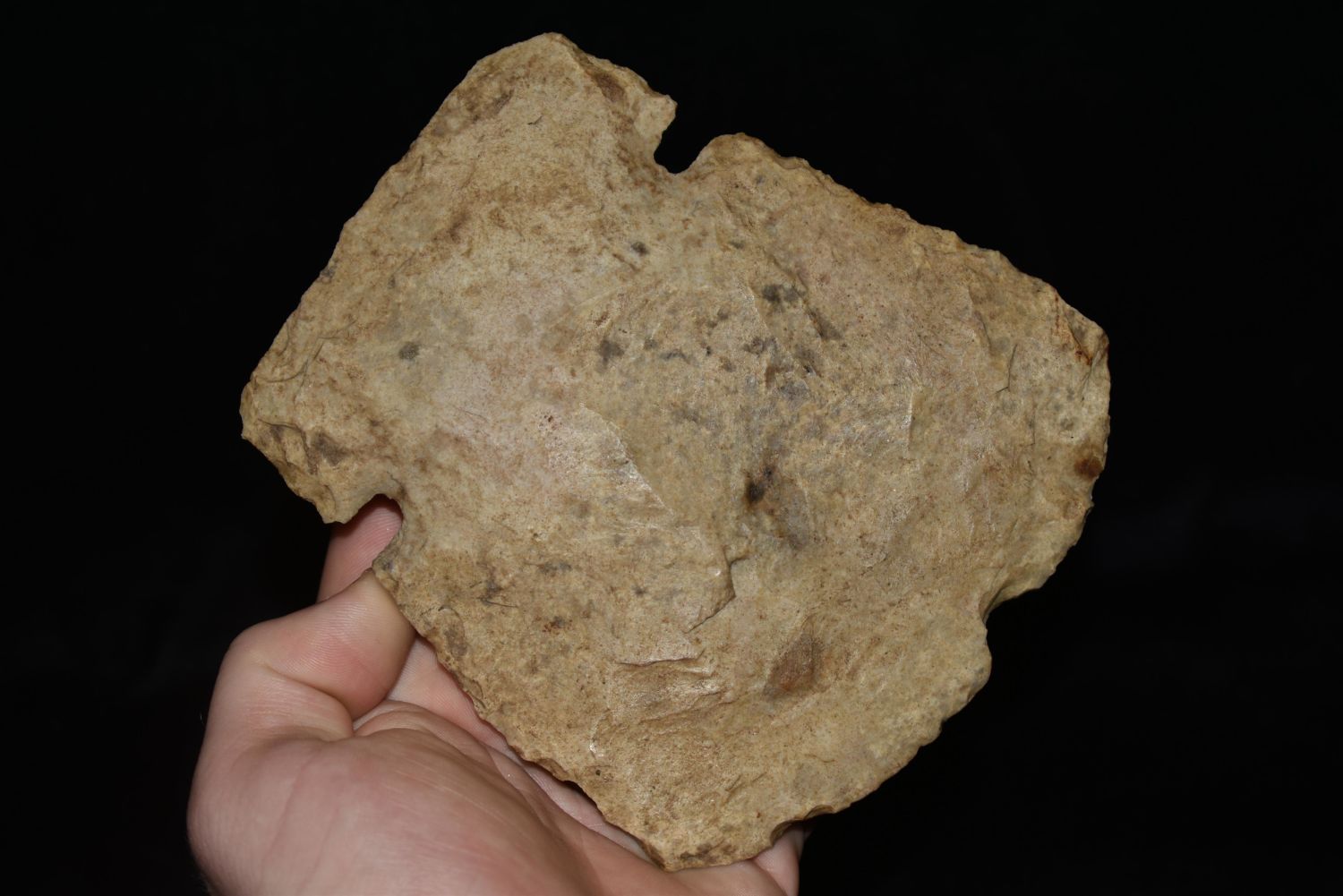5 1/8" LONG NOTCHED HOE FOUND IN MADISON COUNTY, ILLINOIS, NICE BIT POLISH, NATIVE AMERICAN FLINT SPADE, INDIAN ARTIFACT