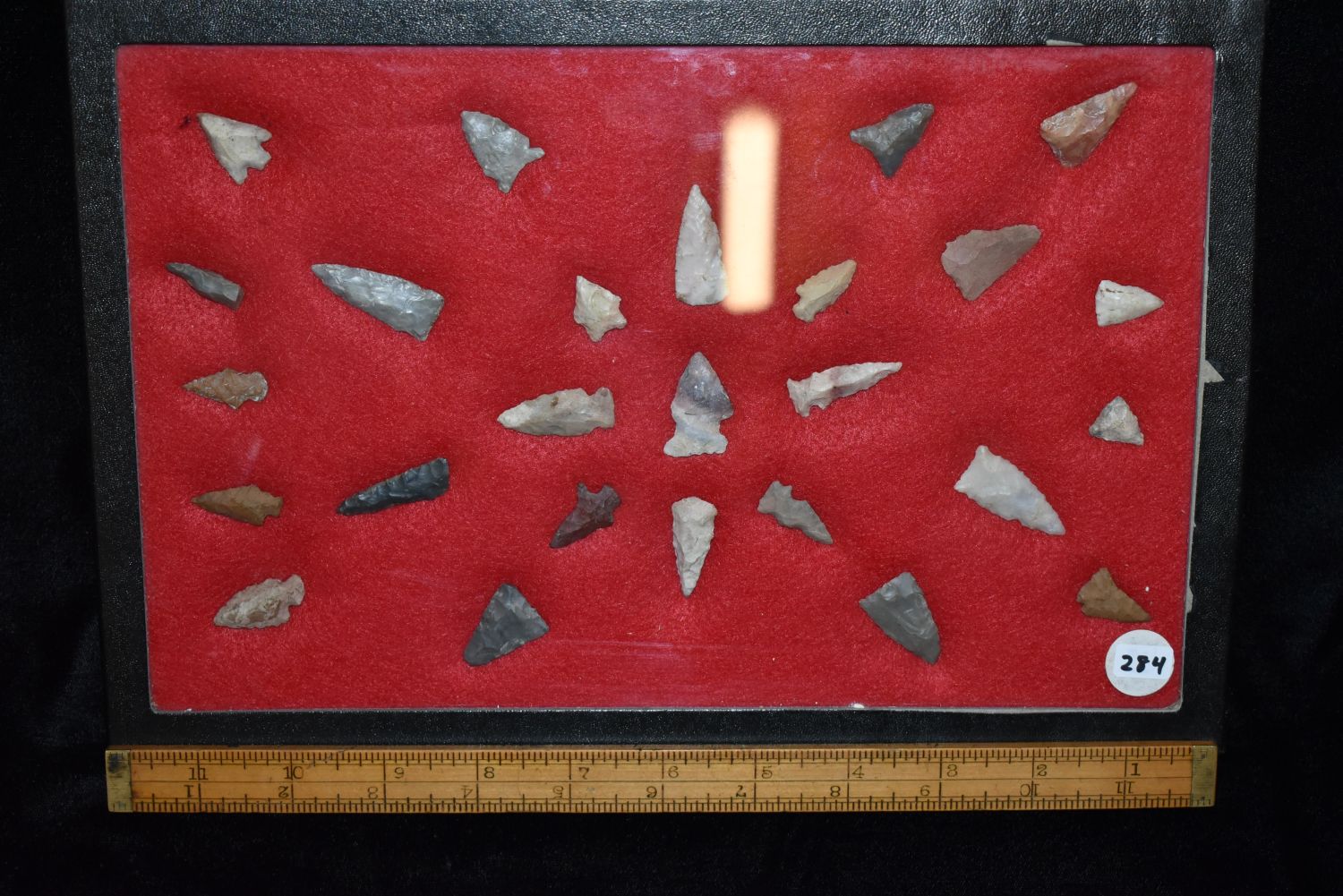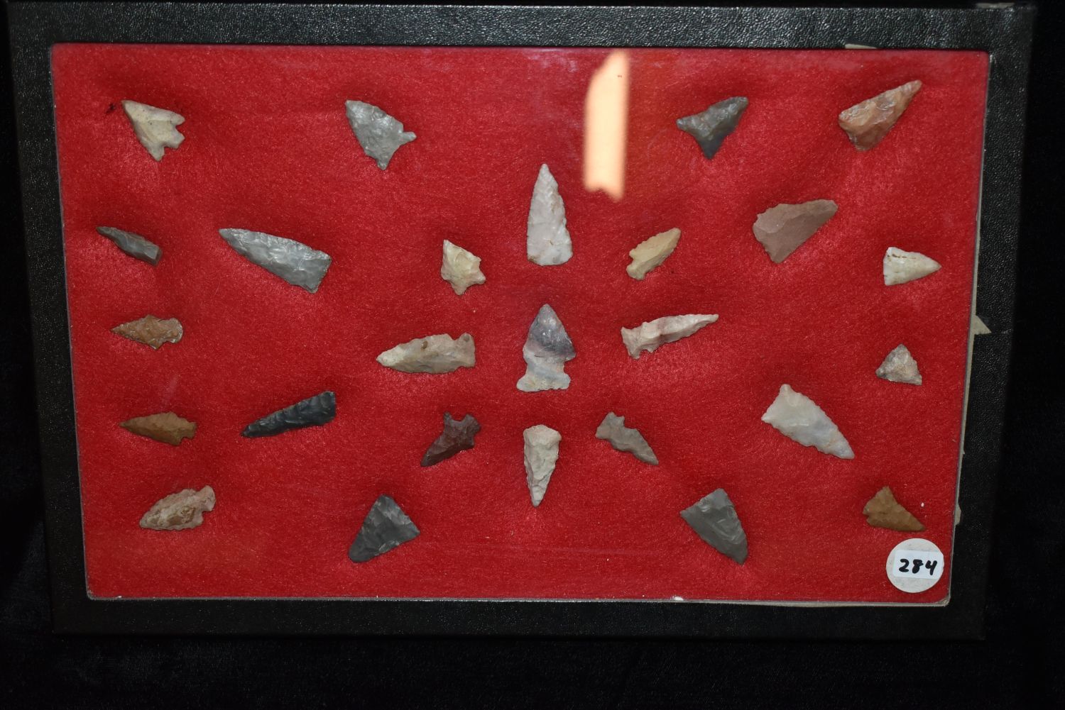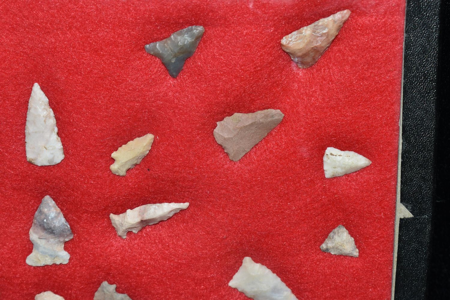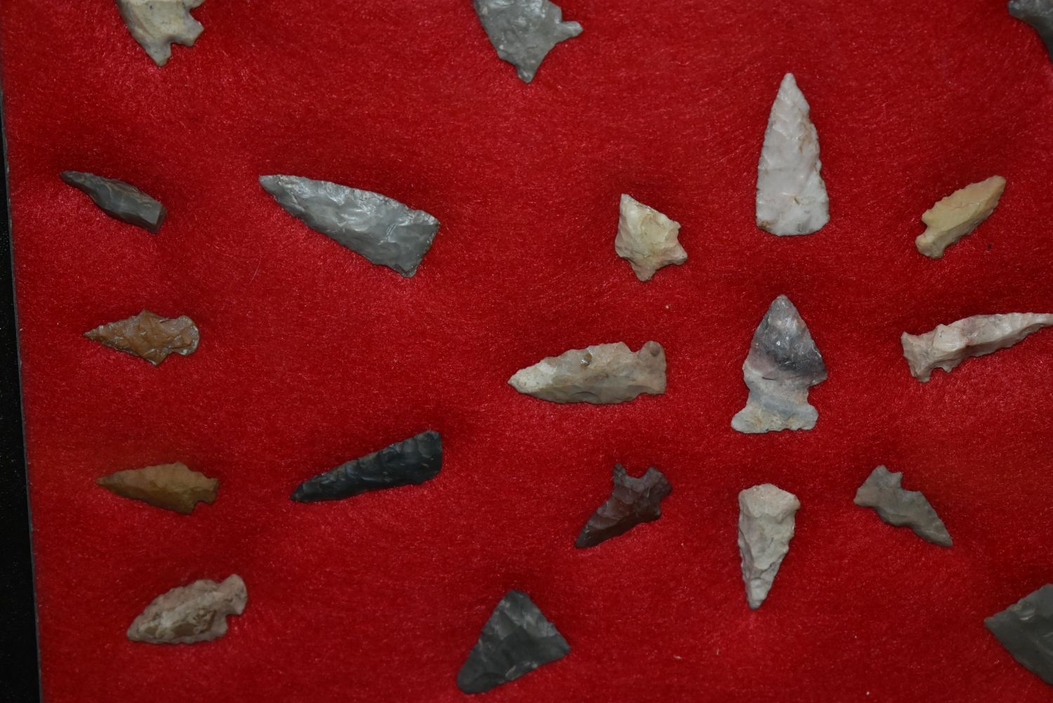8" X 12" RIKER FRAME WITH 26 BIRD POINTS AND 2 SHELL DISC BEADS ALL FOUND IN MADISON AND ST CLAIR COUNTY ILLINOIS