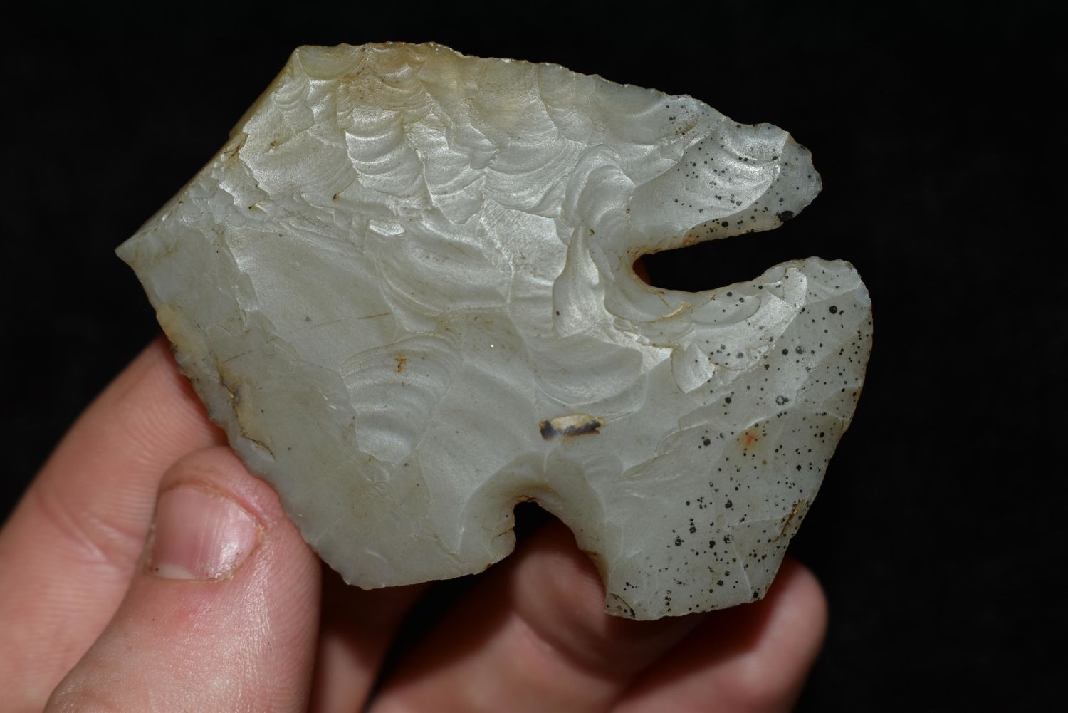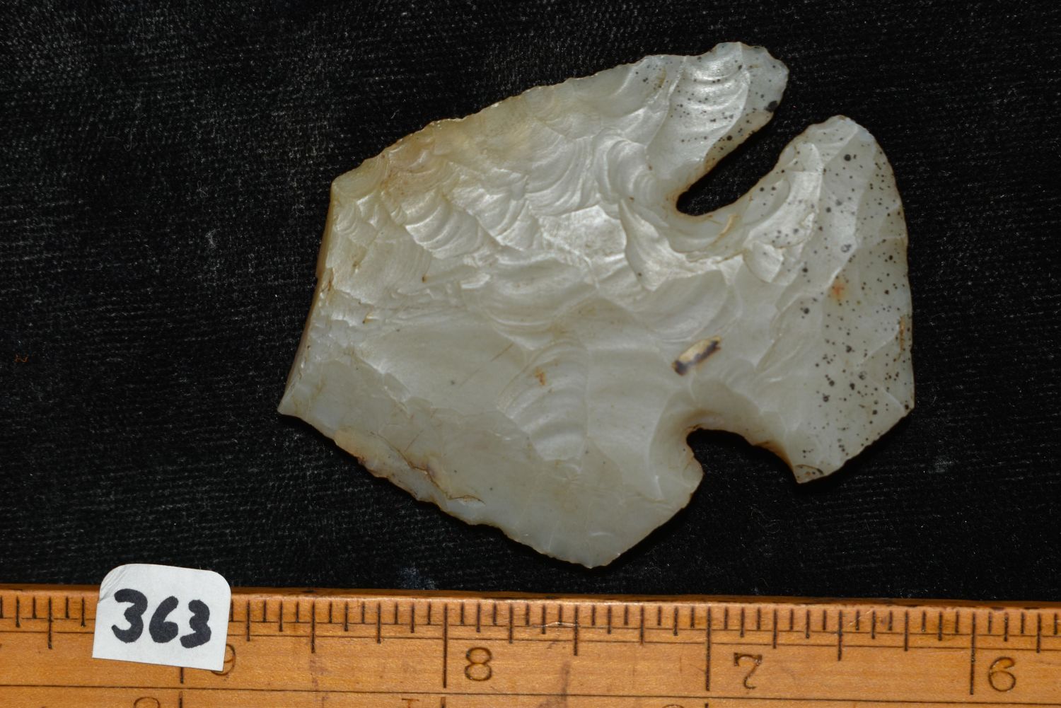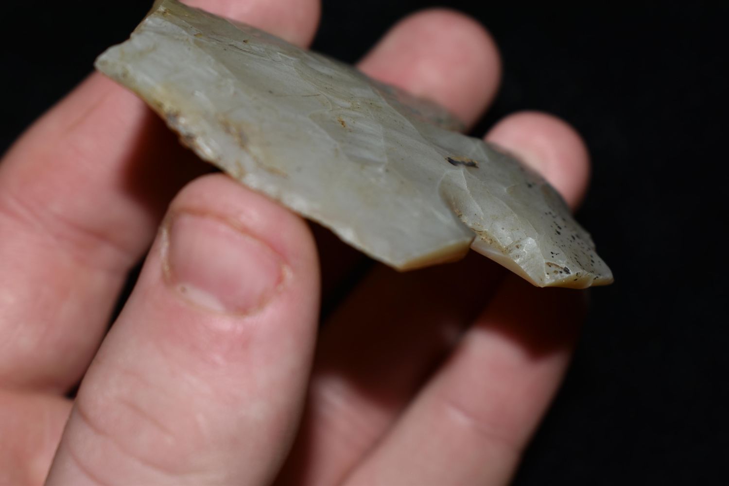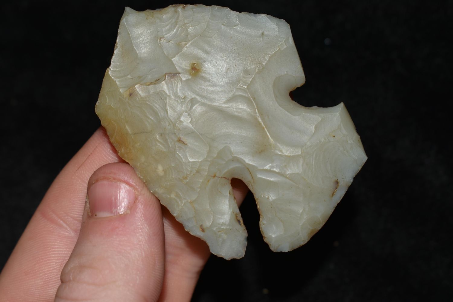 2 3/8" LONG HEARTBREAKER FLINT RIDGE THEBES, HIGHLY TRANSLUCENT, NATIVE AMERICAN ARROWHEAD, INDIAN ARTIFACT