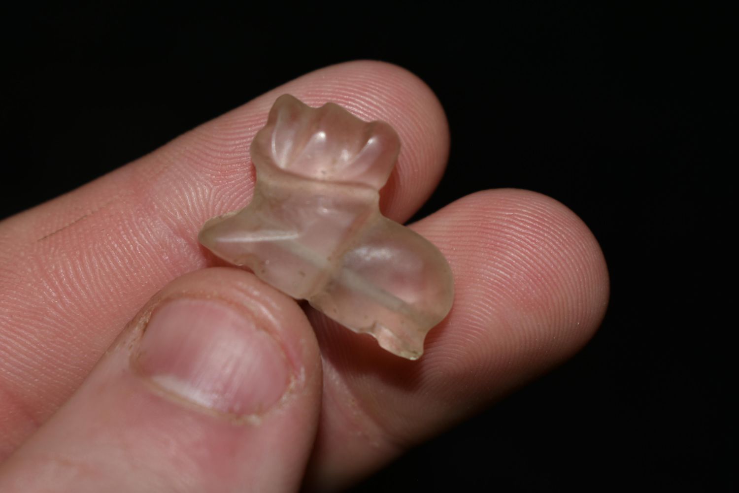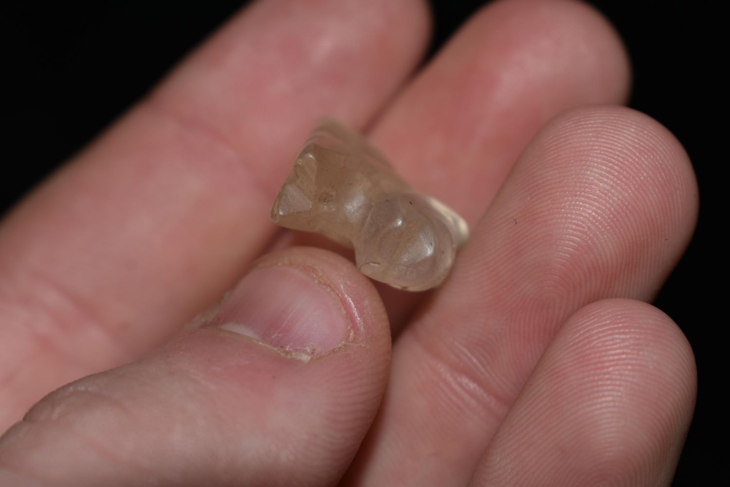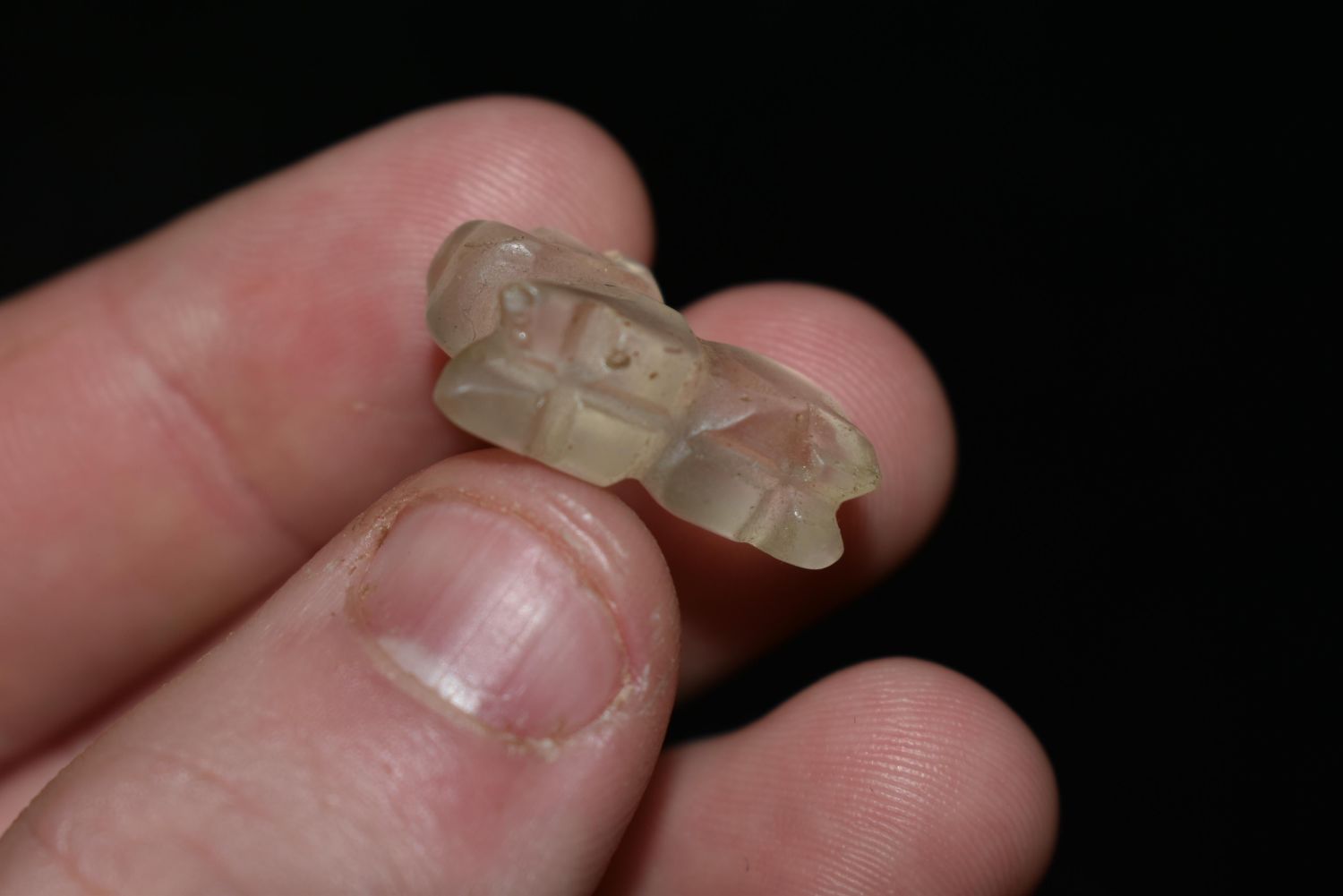 13/16" LONG PRE COLUMBIAN CRYSTAL QUARTZ JAGUAR ANIMAL EFFIGY BEAD FROM MEXICO