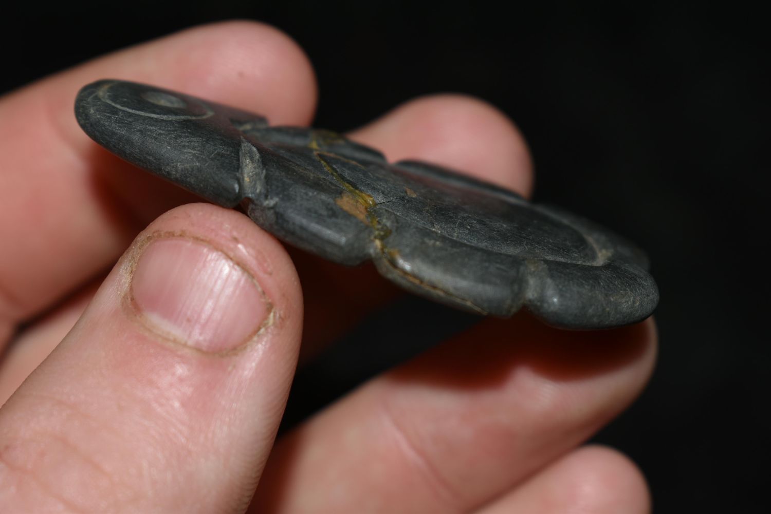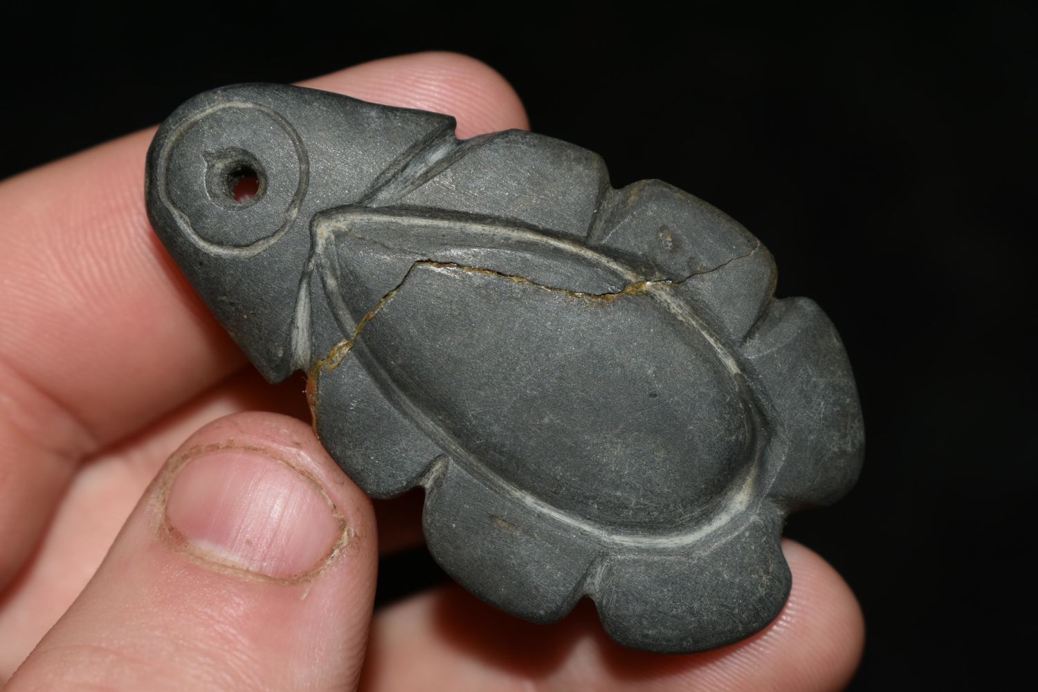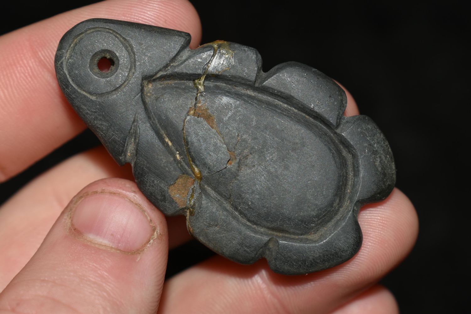 A nicely made Manteno stone pendant from Ecuador, ca. 1000 – 1500 AD. It is 2-1/8” long, depicts a stylized fish and is carved from fine-grained black stone. Nicely polished and drilled for suspension