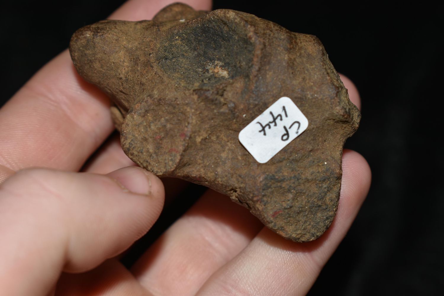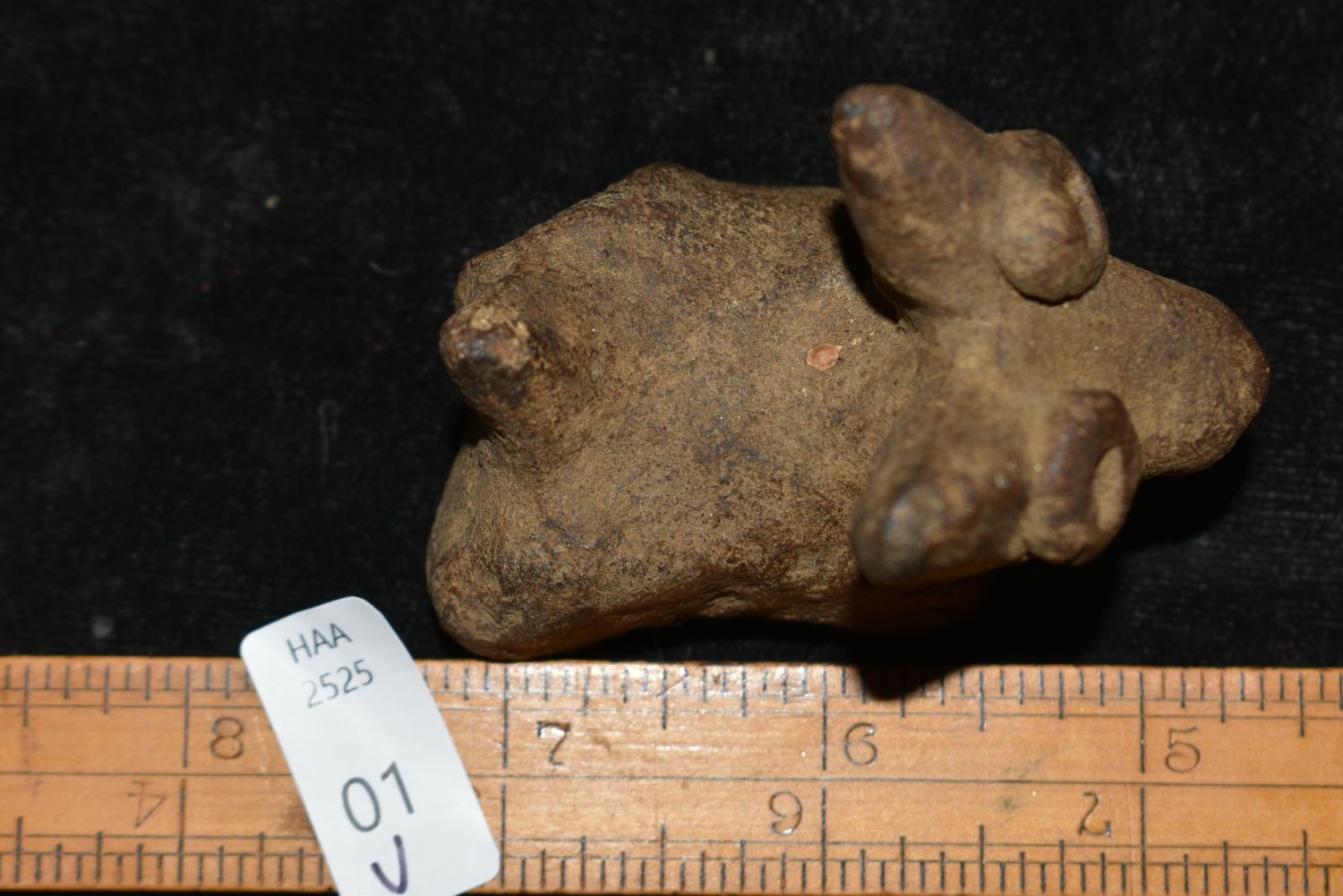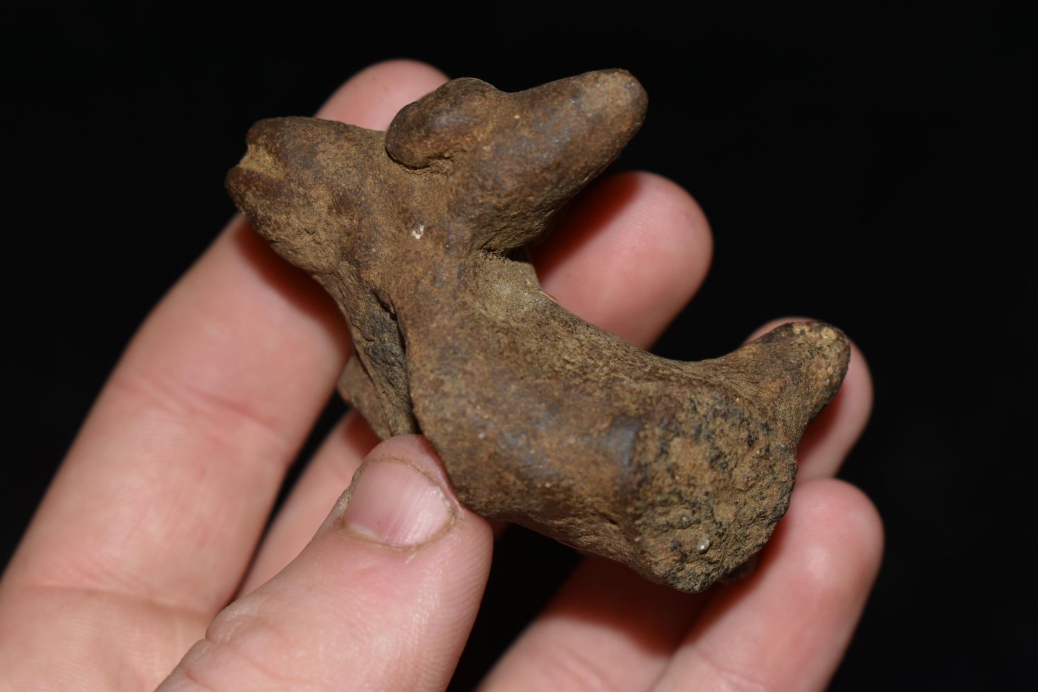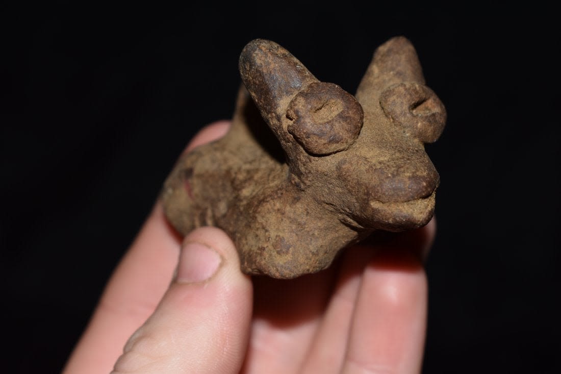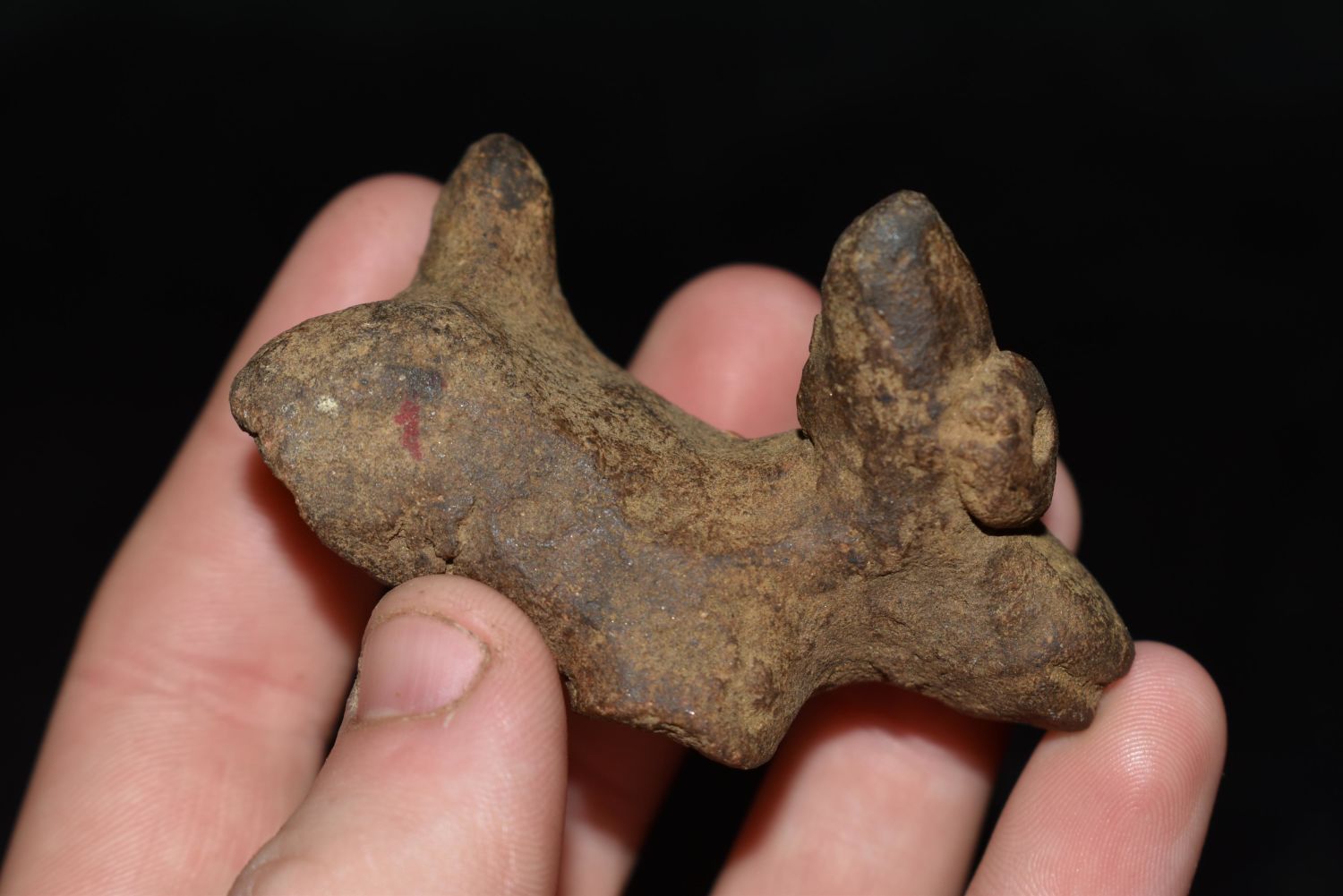 An adorable Chupicuaro canine effigy from Mexico, ca. 400 – 100 BC. This cute doggie is 2-1/2” long and is depicted with an expressive face that features large eyes. Strong mineral deposits.