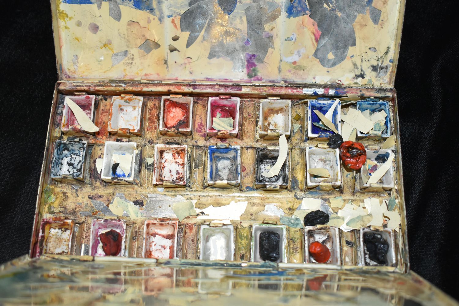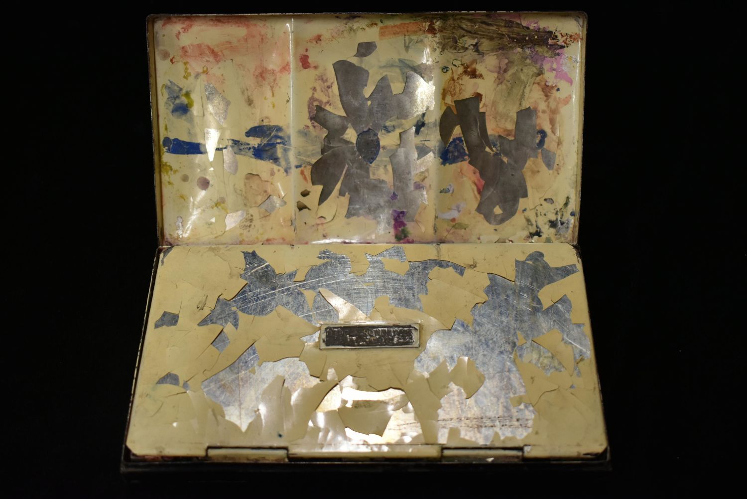 Victorian Paint Box and Pallet. Box has metal tag inside that reads George Romney and Co London 6 3/4" by 3 3/4". Pallet is 12 1/4 by 7 1/8".