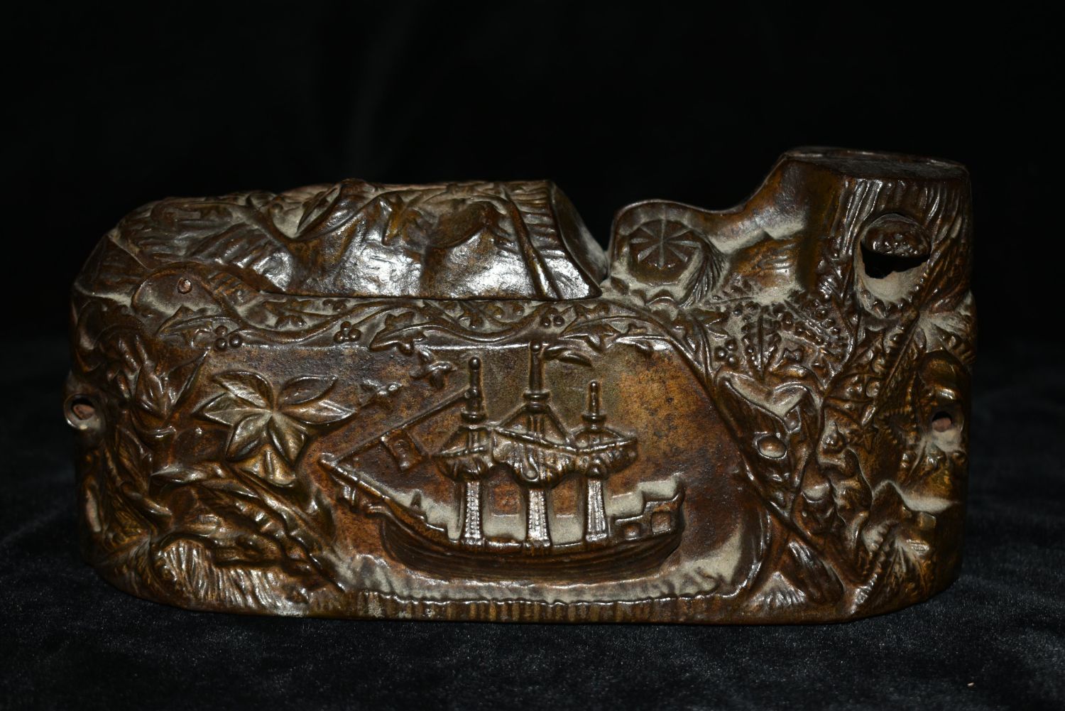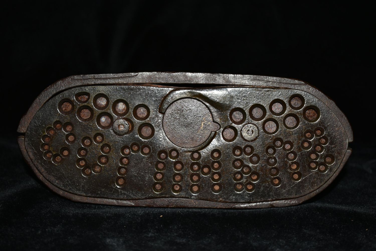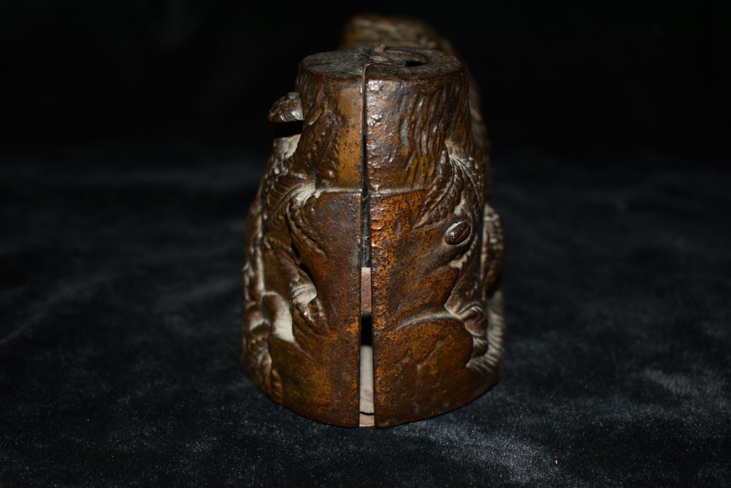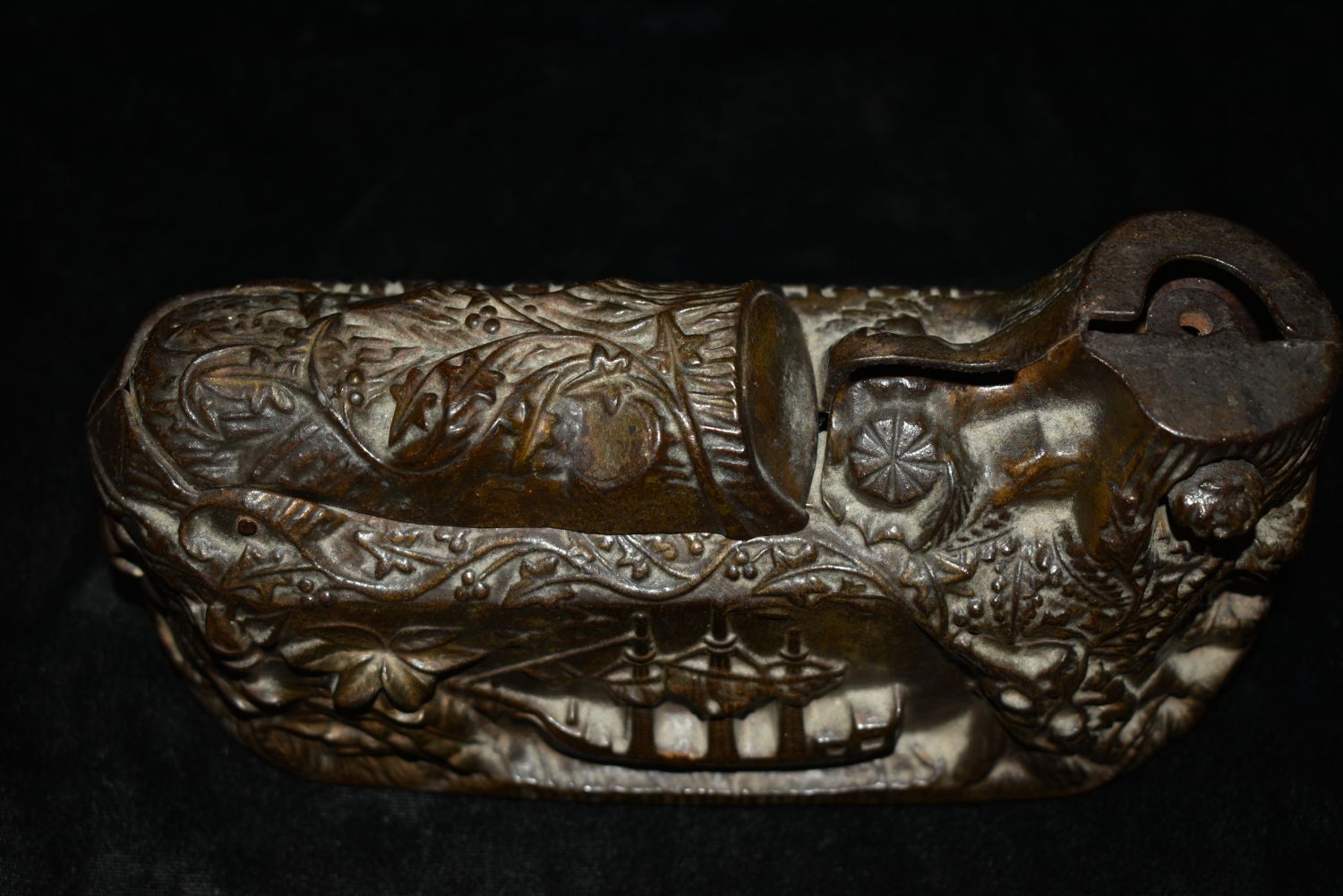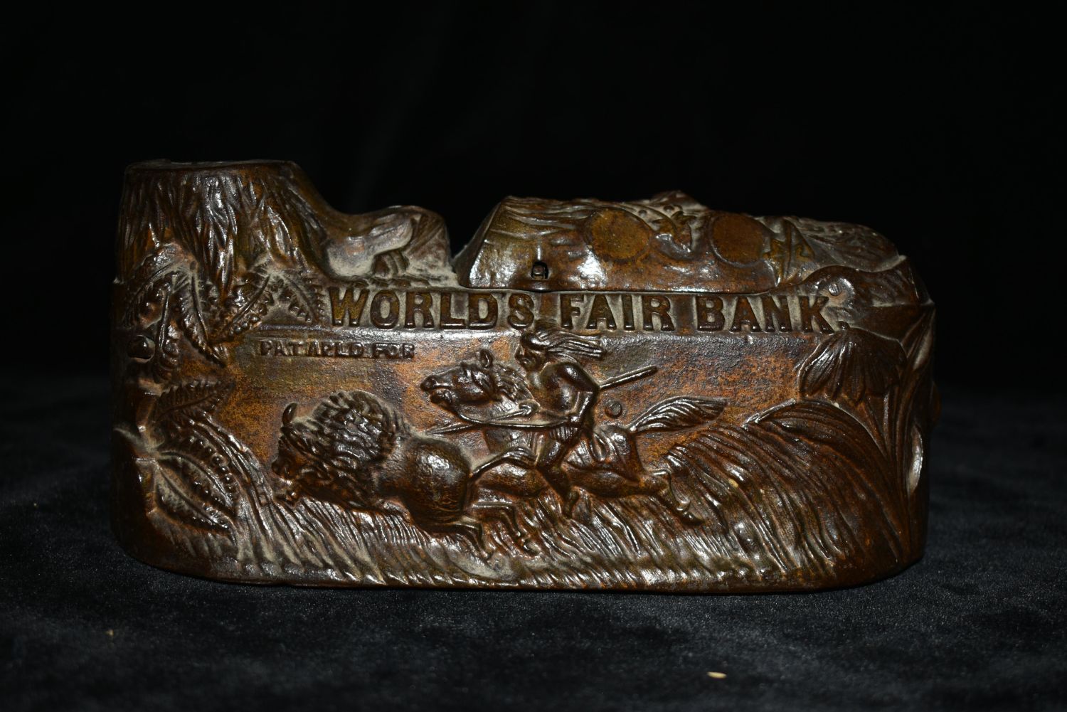 Cast Iron ‘World’s Fair Bank’ Mechanical Bank Having an 1893 patent mark on the underside coin cover and a figure of Columbus(Columbus is missing on this one) with a Native American that pops out of the opposite side when the mechanism is activated Height: 6.50 inches, Width: 8.00 inches. The Body of the bank and the indian are in good repair. Parts could make a who one if you have one that is damaged that has Columbus.