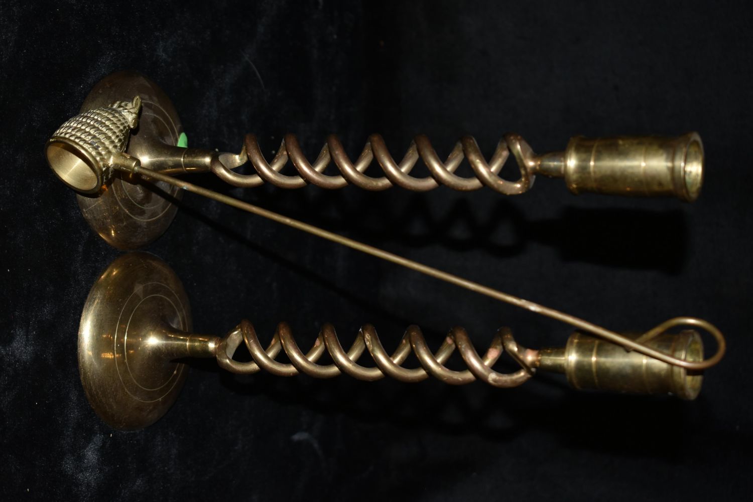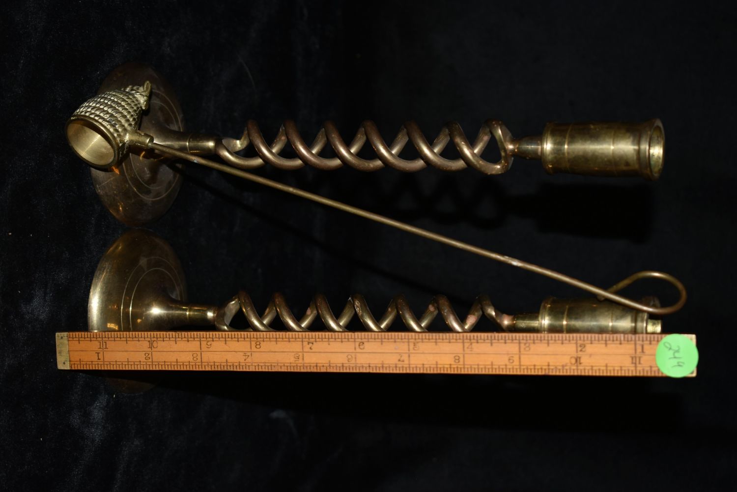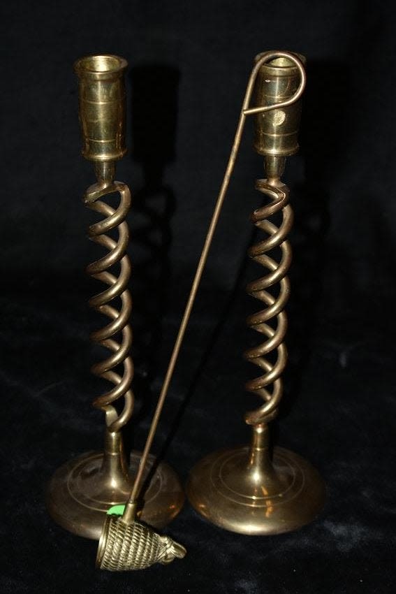 Pair of Antique Brass Candle Holders along with Brass Candle Snuffer. Candles are 11" Tall. Snuffer is 12"