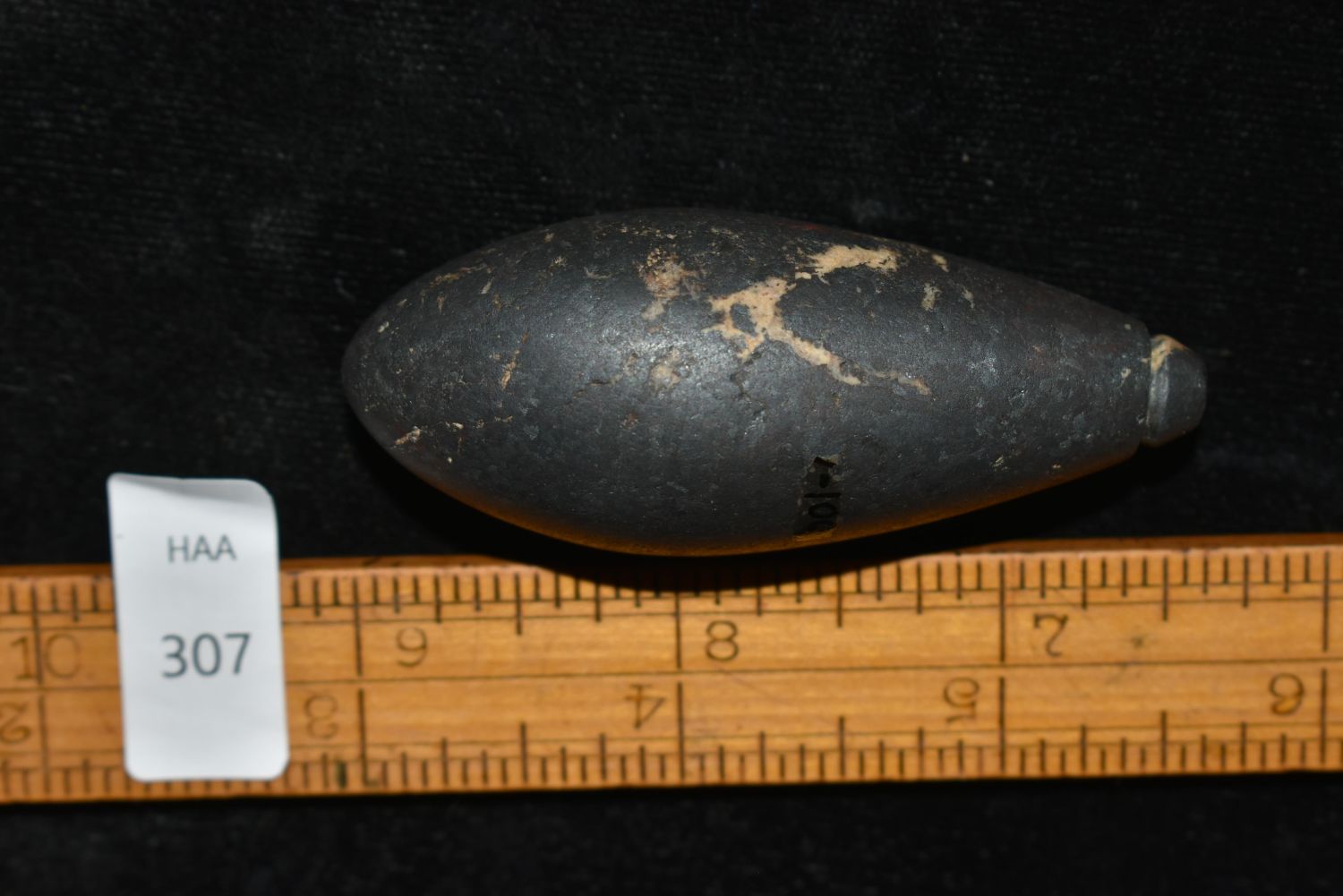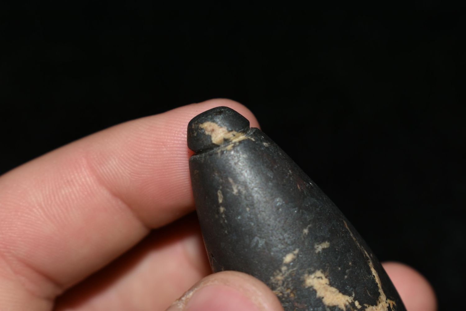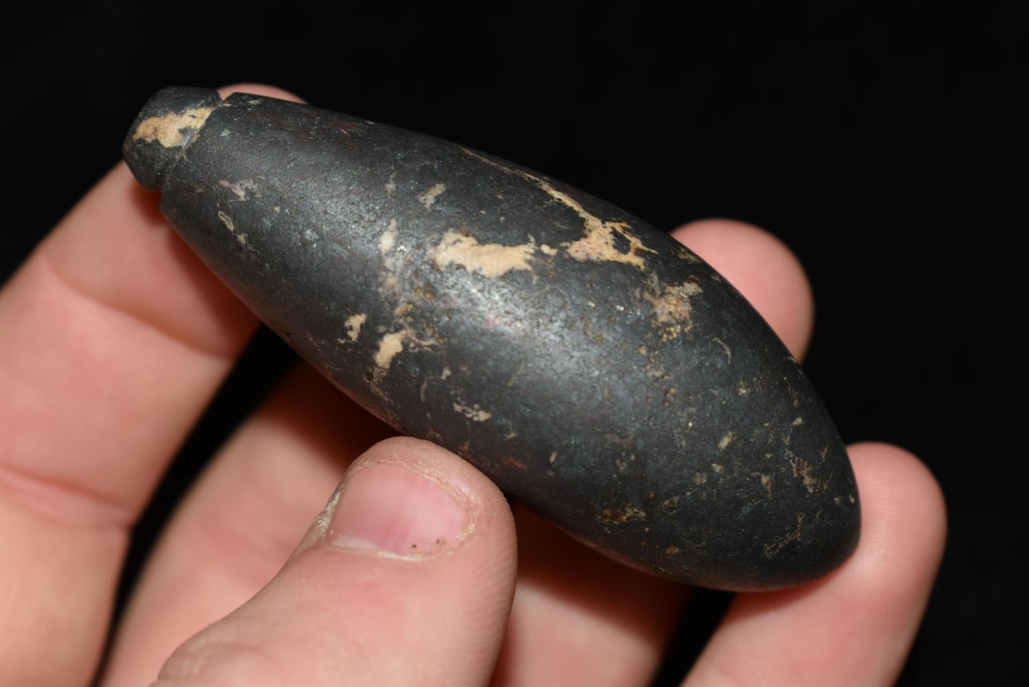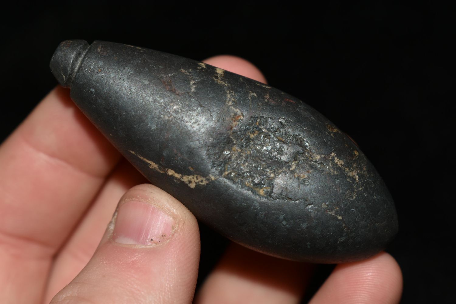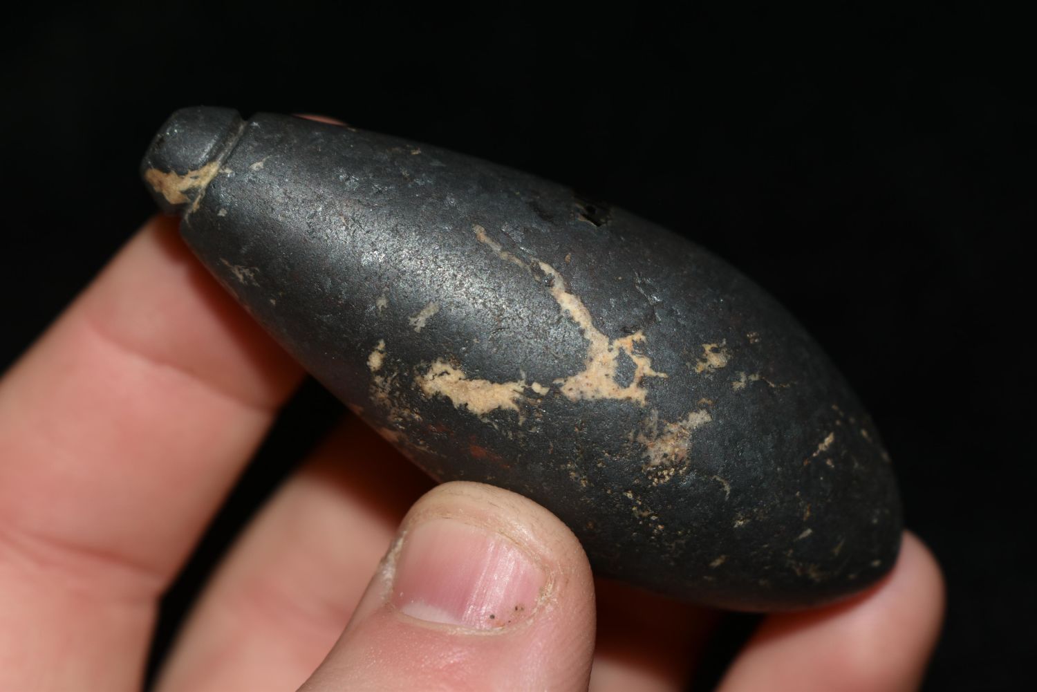 2 5/8" Hematite Plummet found by Stanley Razmus in Vermillion Co., Indiana. Pictured In Artifacts of The Midwest on Page 31 Authentic Native American Artifact Arrowheads