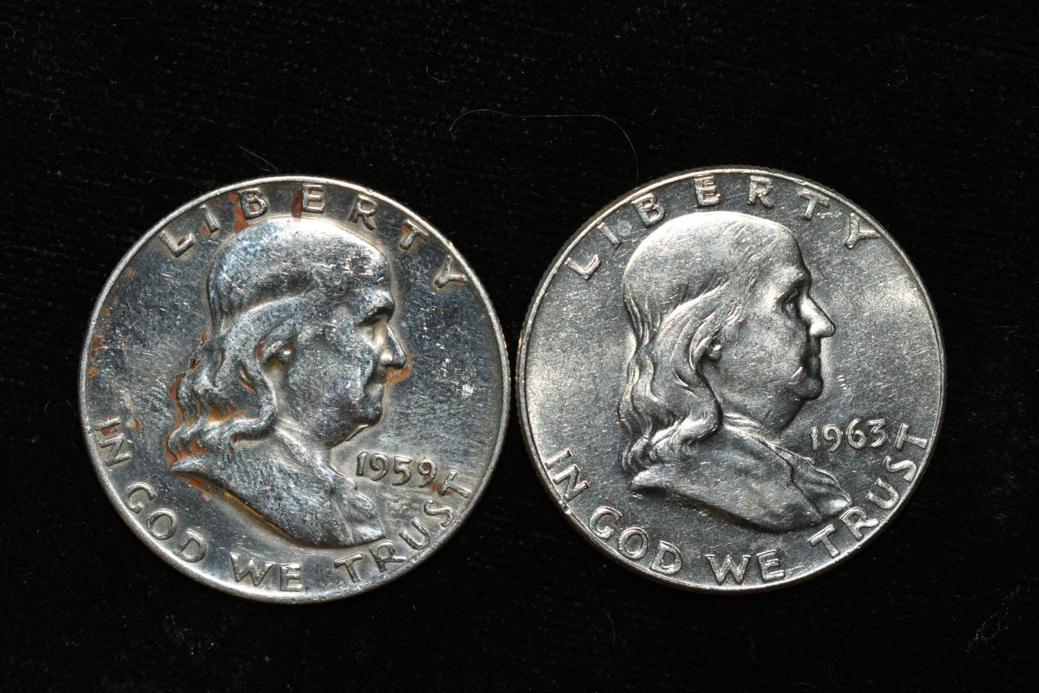 Two uncirculated Franklin half dollars. 1963 D and 1959.