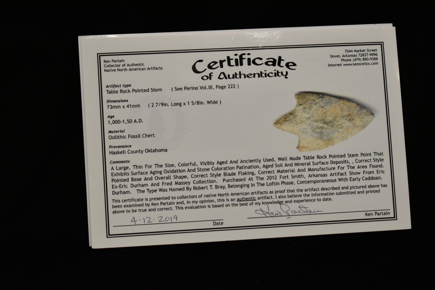 2 7/9" Table Rock Pointed Stem, Haskell Co., Oklahoma, Partain C.O.A Authentic Native American Artifact