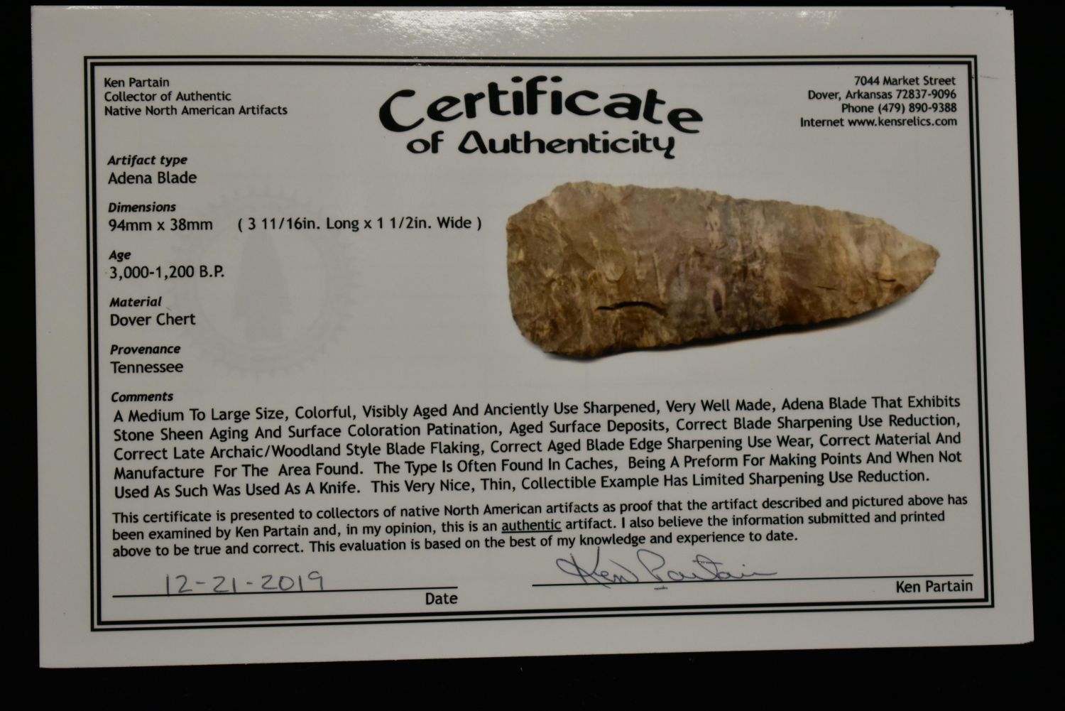 3 11/16" Adena Blade found in Tennessee, Partain C.O.A Authentic Native American Artifact