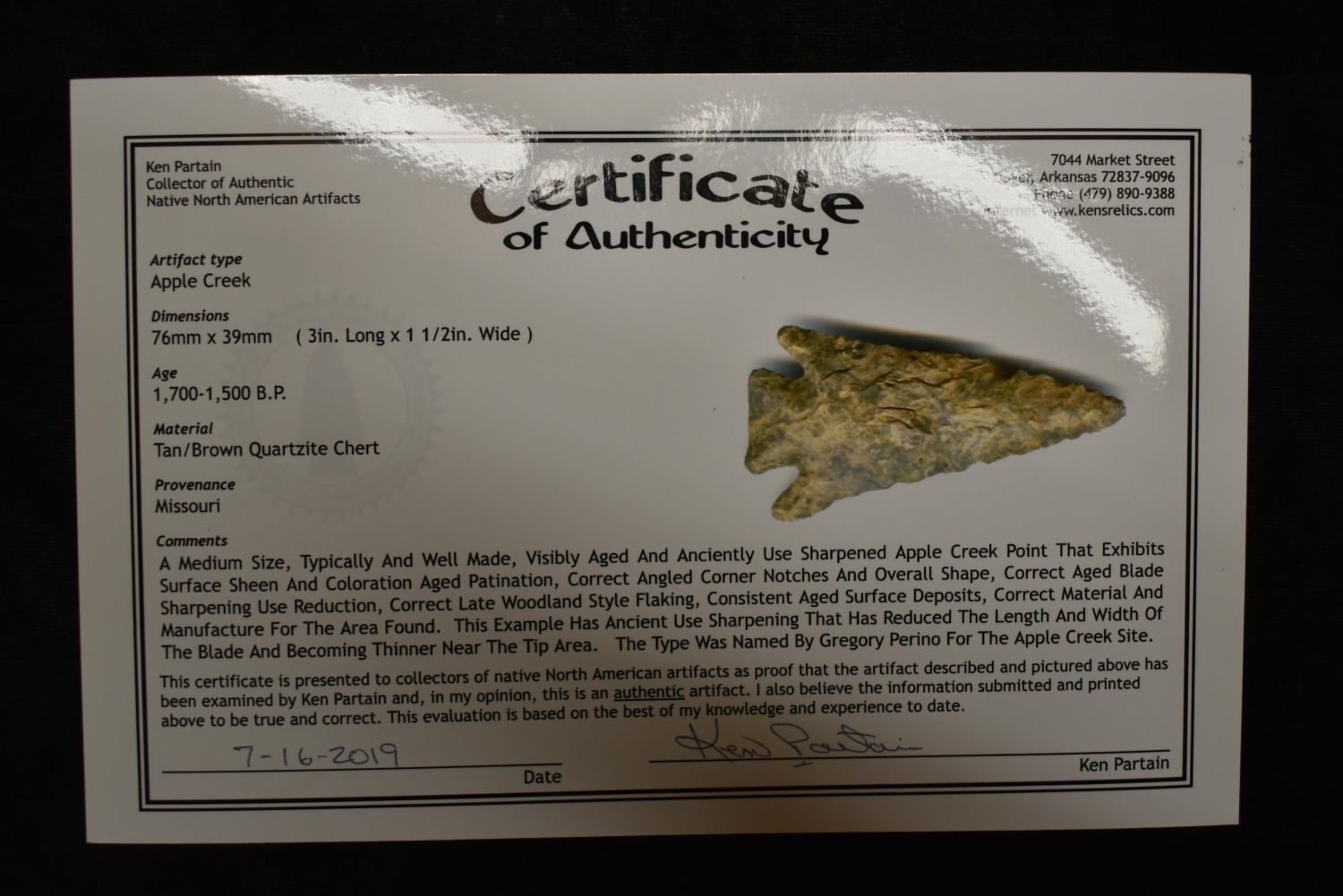 3" Apple Creek, Missouri, Partain C.O.A Authentic Native American Arrowhead