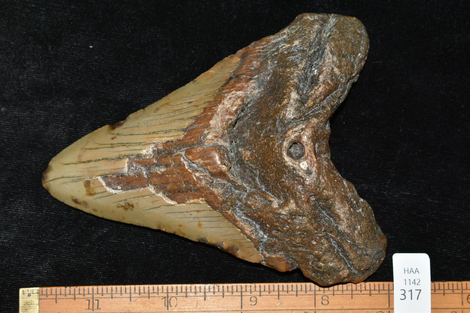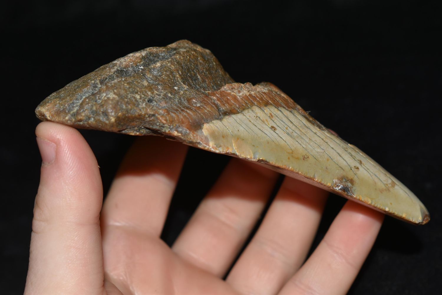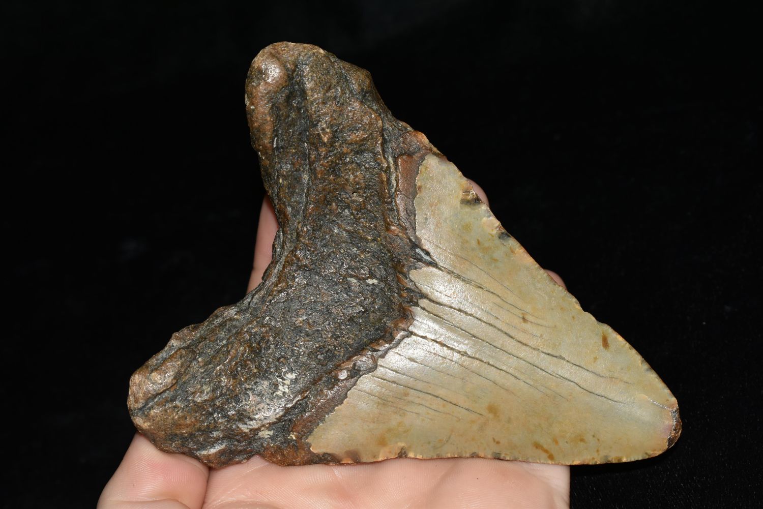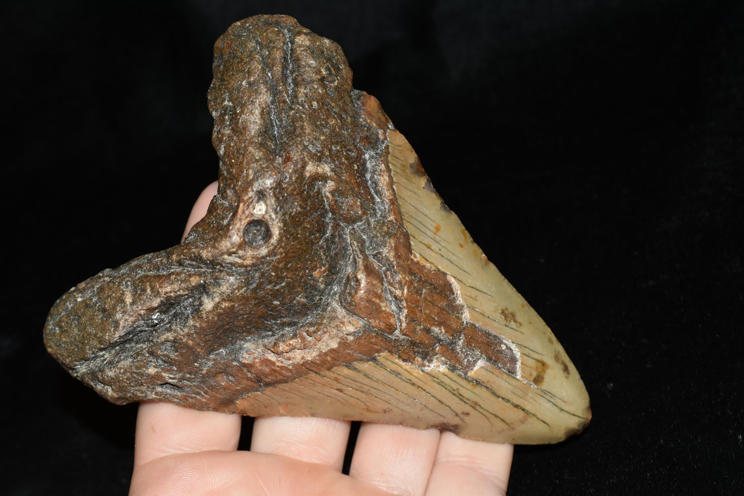 HUGE MEGALODON SHARK TOOTH FOSSIL FOUND OFF THE COAST OF THE CAROLINAS, 5" AT THE LONGEST SIDE