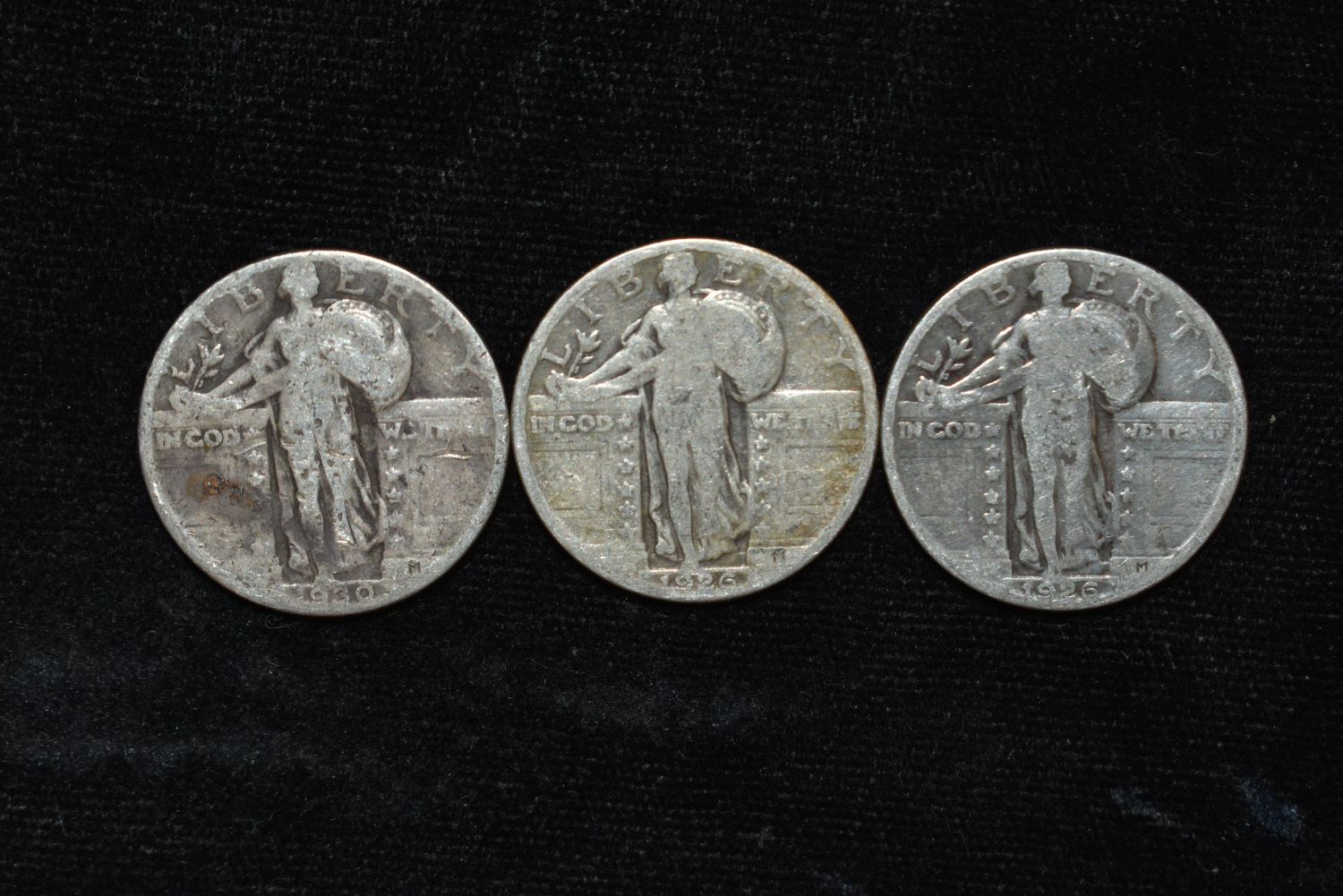 LOT OF 3 EARLY 1900’S SILVER QUARTERS, STANDING LIBERTY, 1926, 1926, 1930