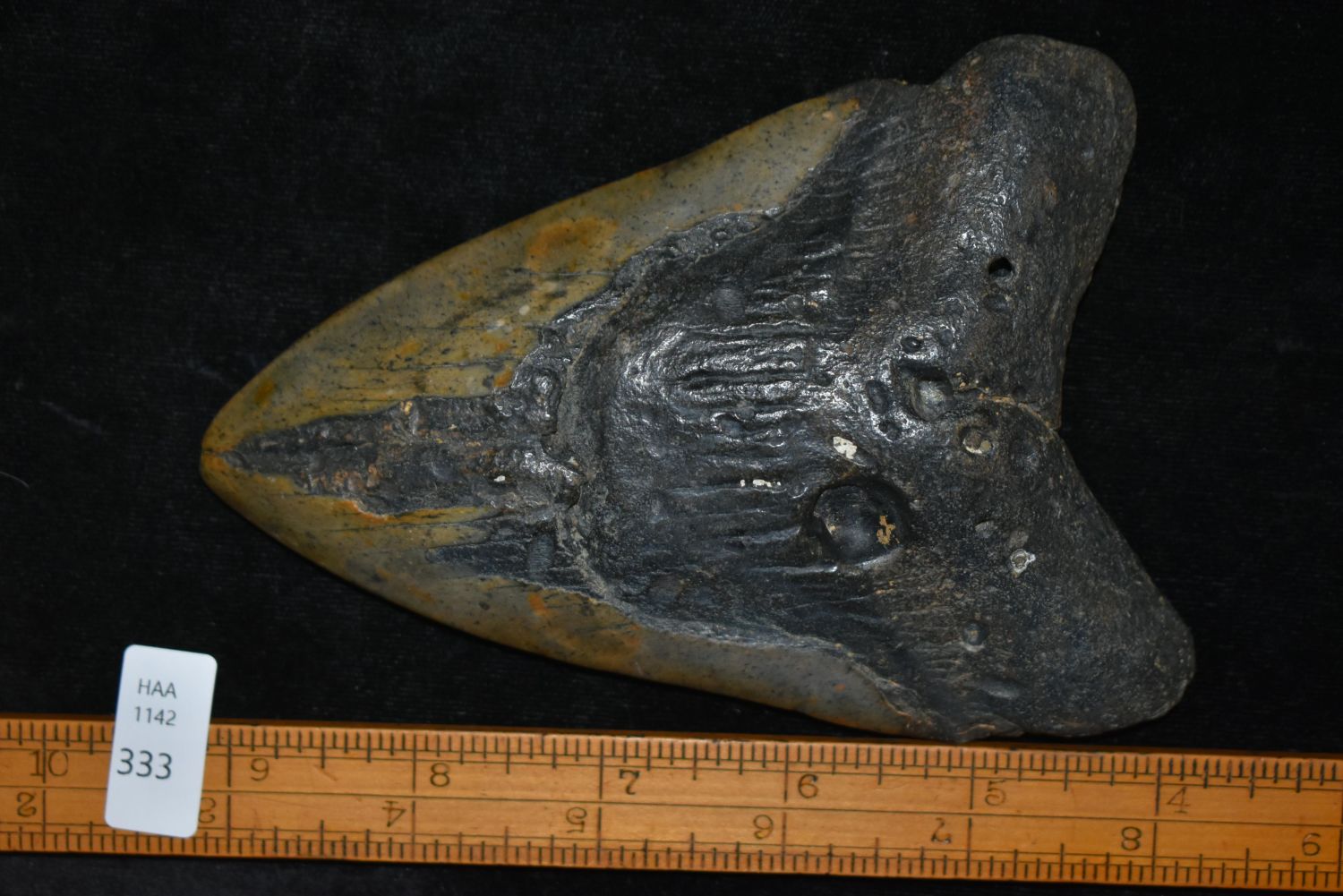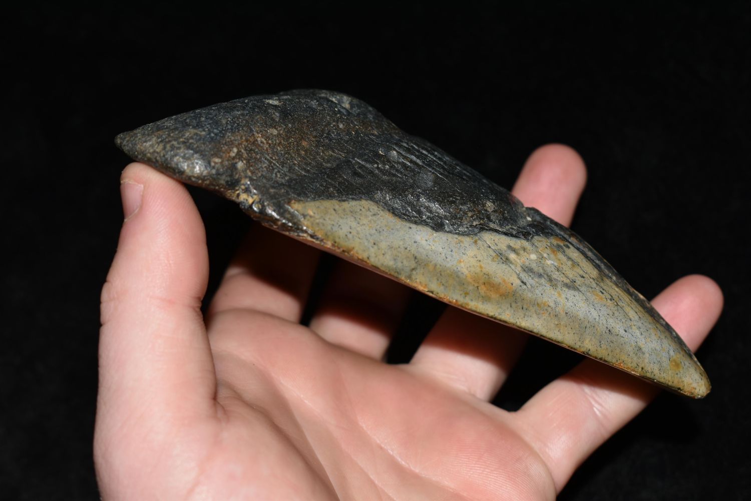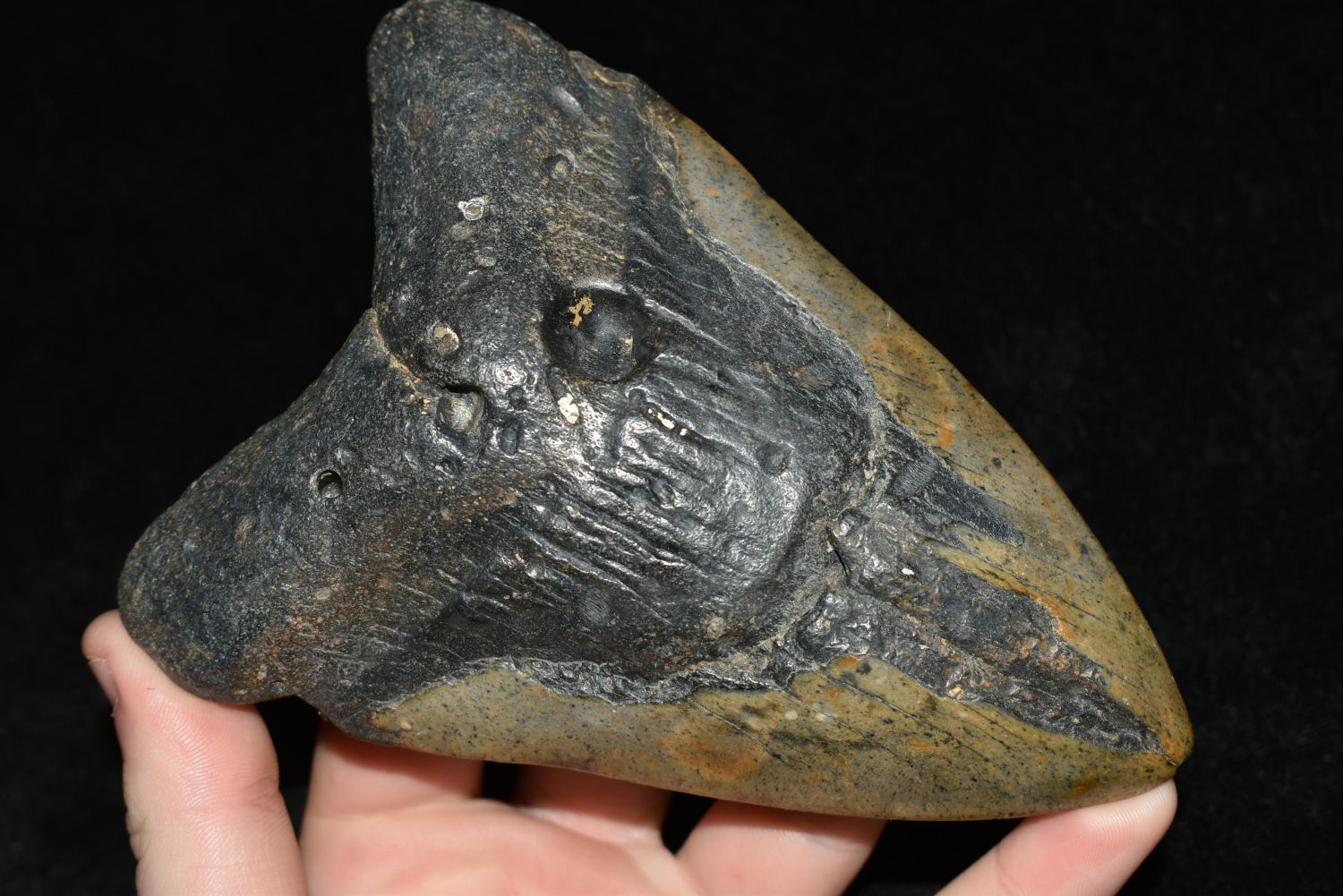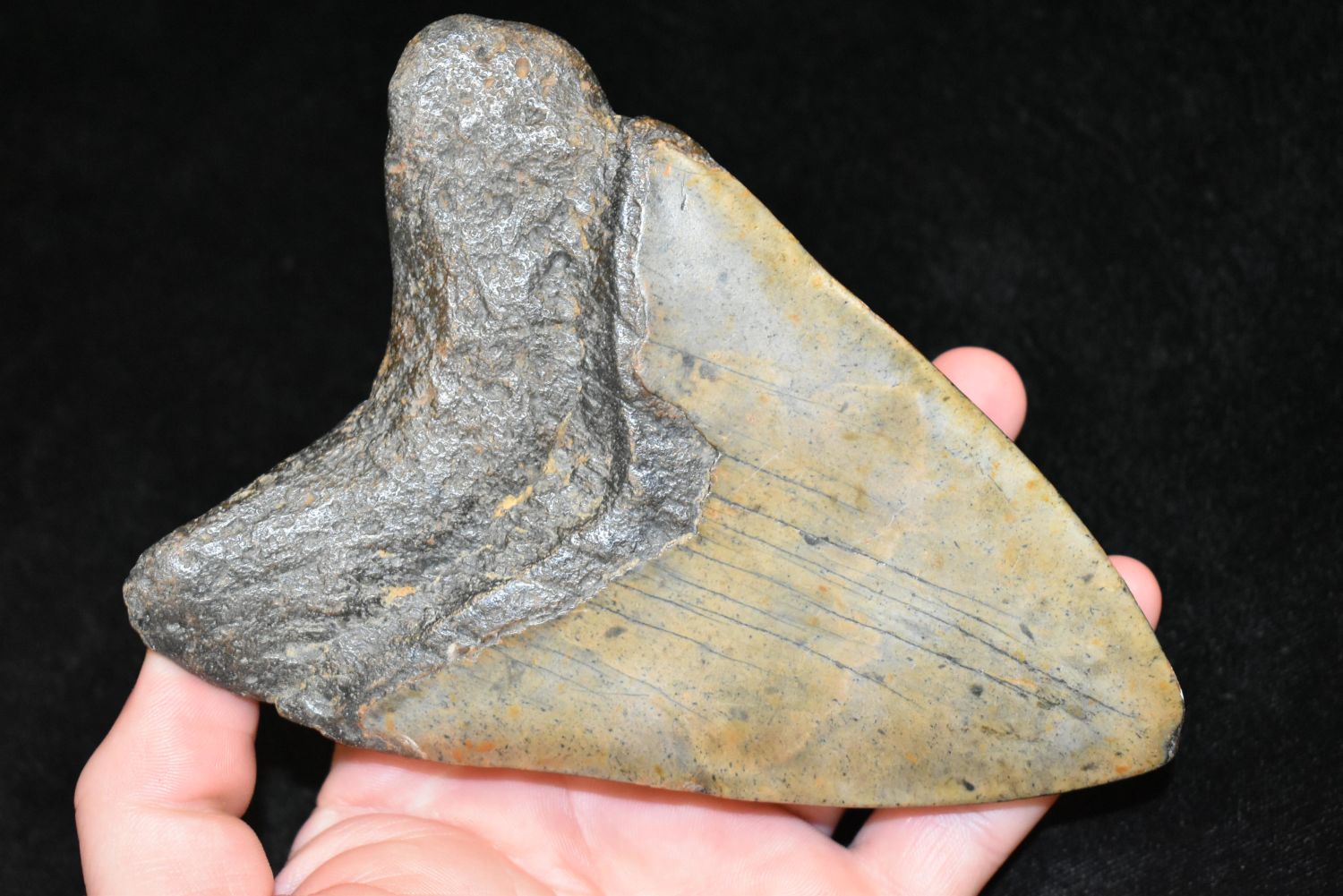 HUGE MEGALODON SHARK TOOTH FOSSIL FOUND OFF THE COAST OF THE CAROLINAS, 5 1/2" AT THE LONGEST SIDE