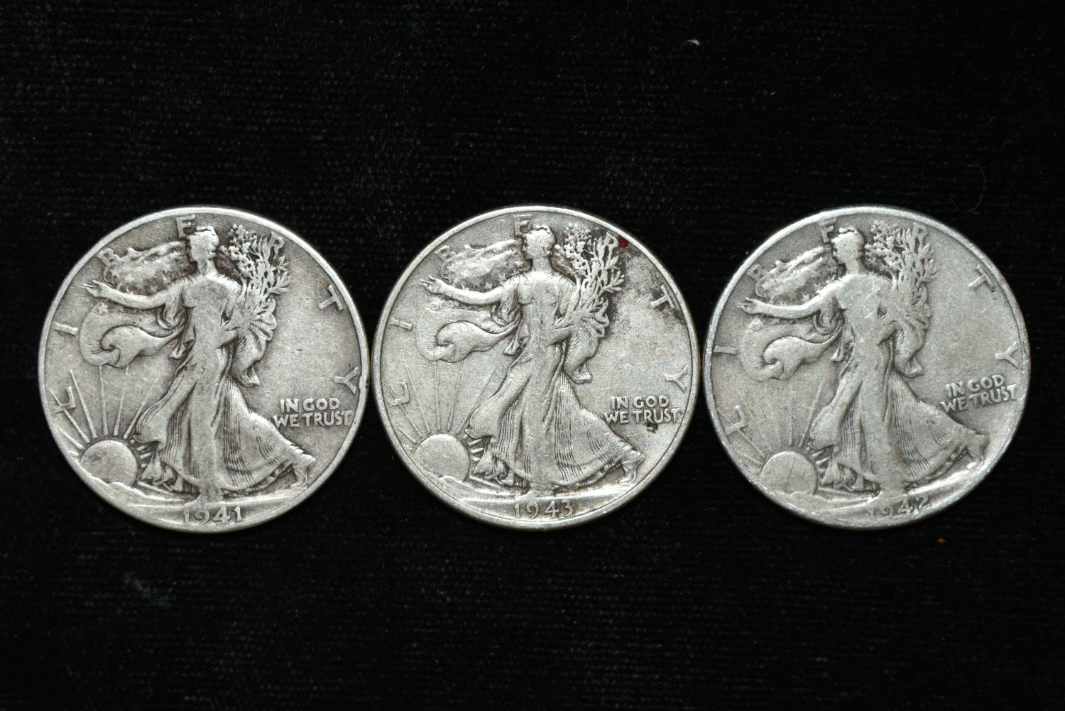 LOT OF 3 WALKING LIBERTY SILVER HALF DOLLARS, 1941, 1942, 1943