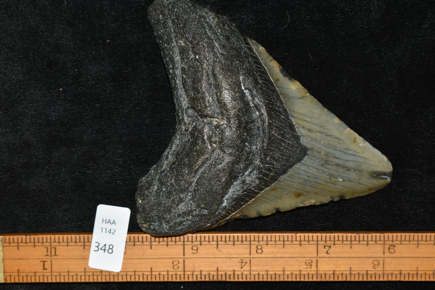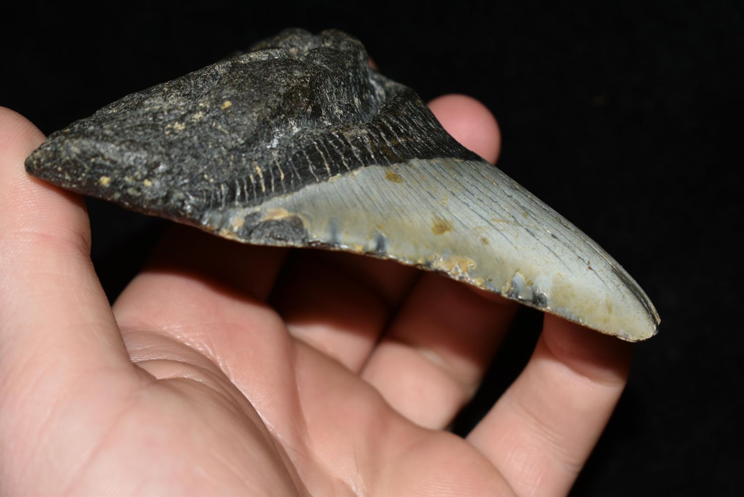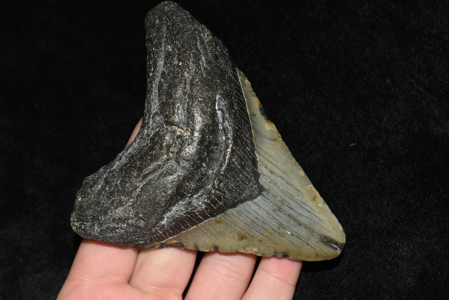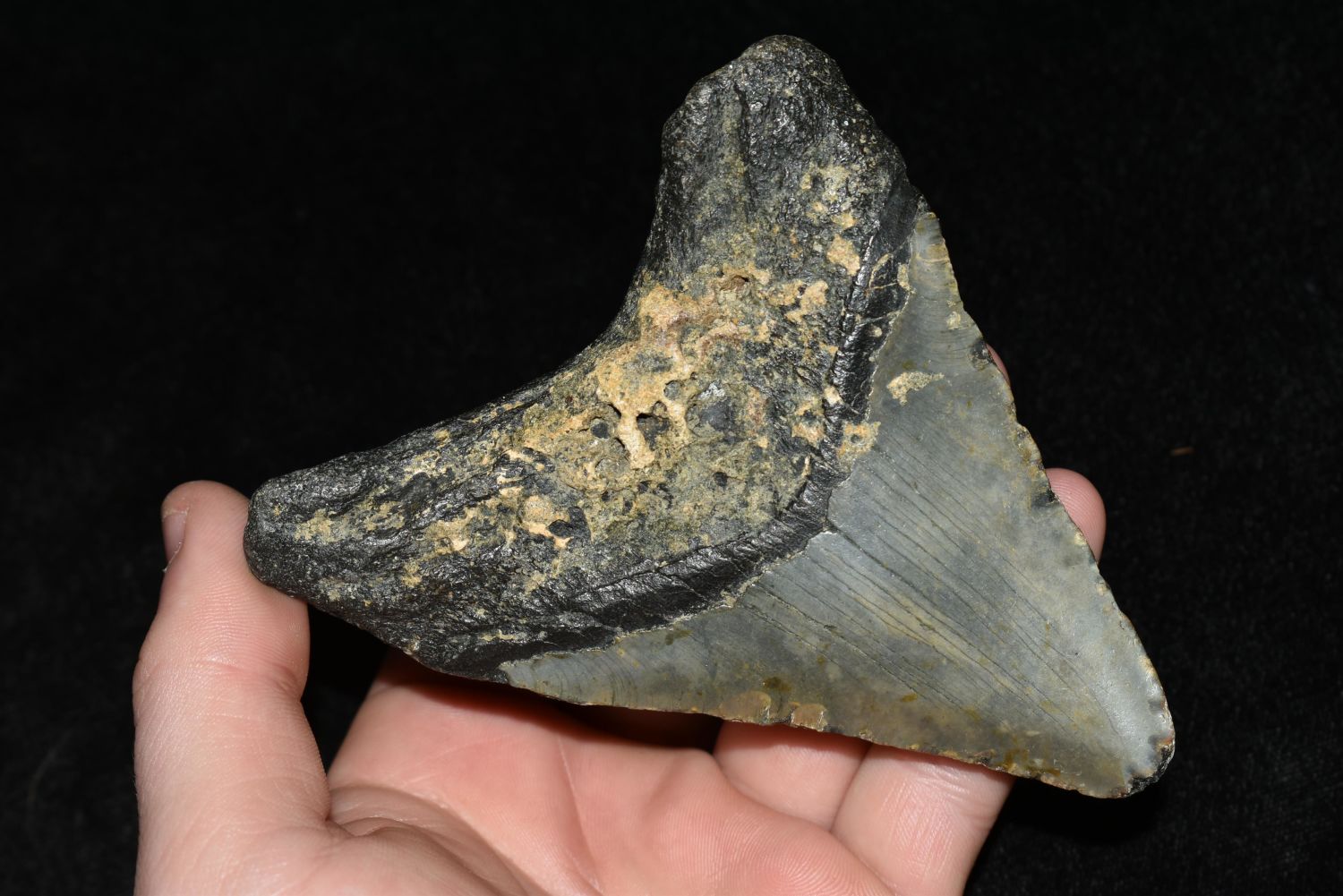 HUGE MEGALODON SHARK TOOTH FOSSIL FOUND OFF THE COAST OF THE CAROLINAS, 4 1/2" AT THE LONGEST SIDE