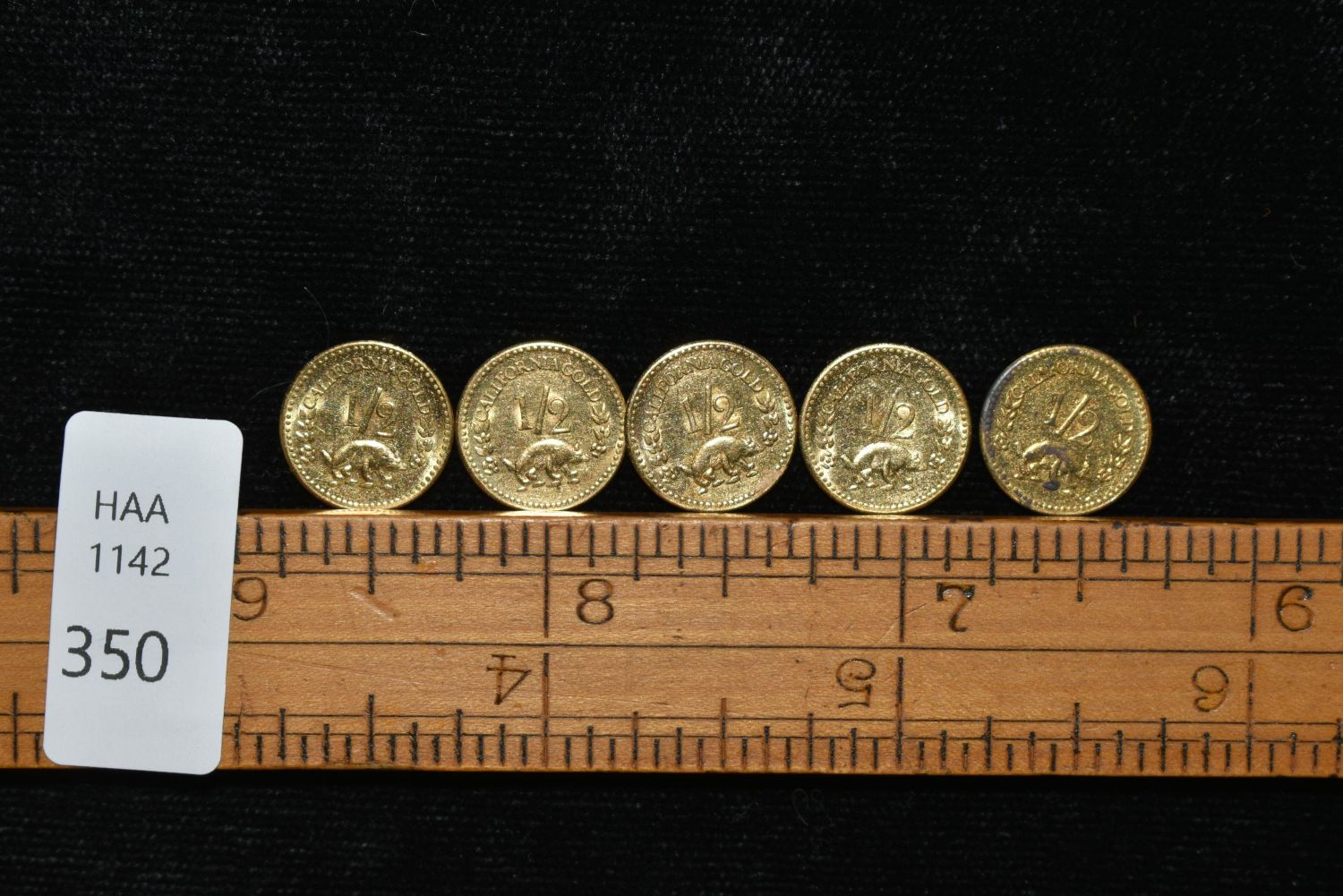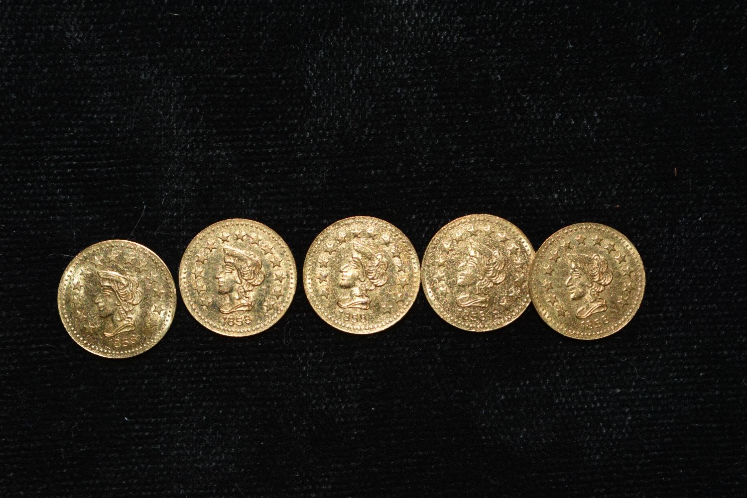LOT OF 5 CALIFORNIA GOLD RUSH ERA TOKENS, GOLD CONTENT UNKNOWN