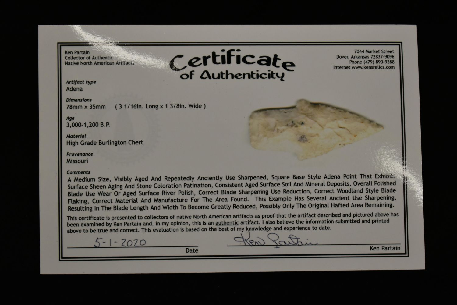 3 1/16" Adena, Missouri, Partain C.O.A Authentic Native American Arrowhead