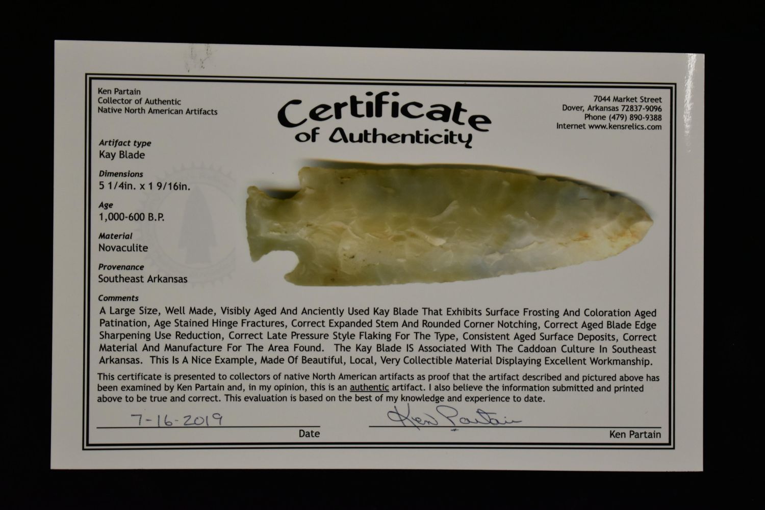5 1/4" Kay Blade found in SE Arkansas Partain C.O.A Authentic Native American Artifact