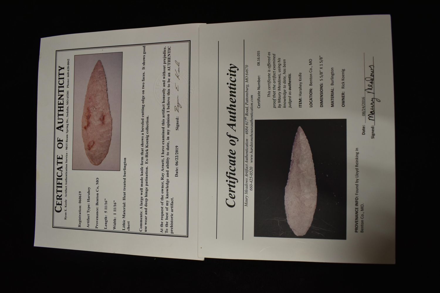 5 5/8" Harahey Knife found in Benton Co., Missouri, Meadows/Keele C.O.A Authentic Native American Artifact