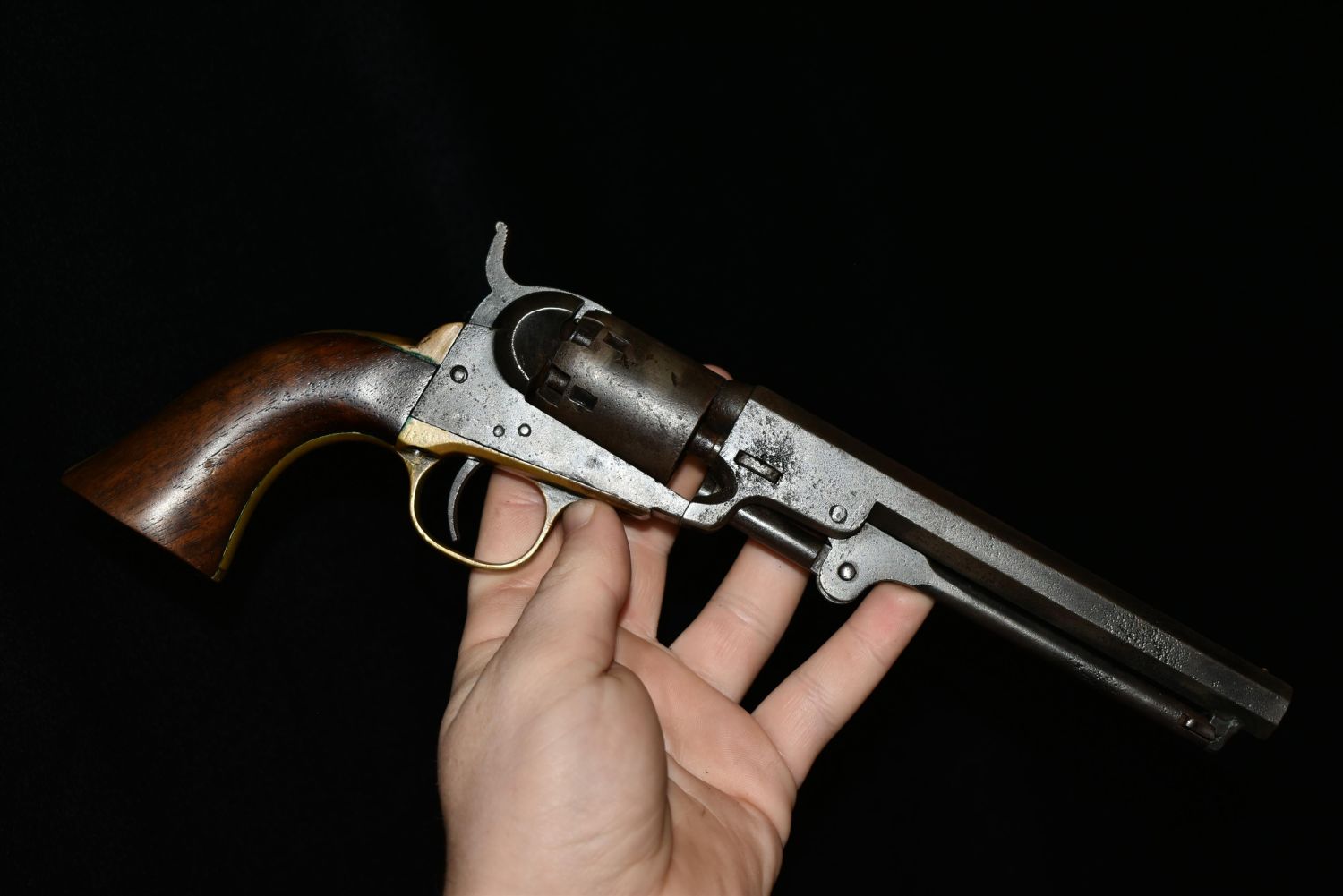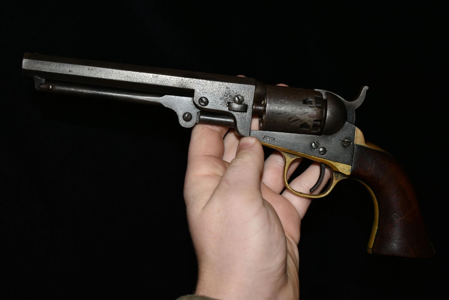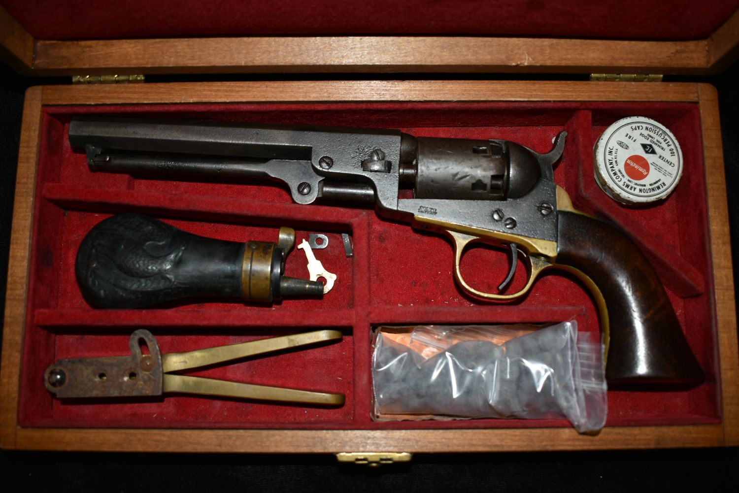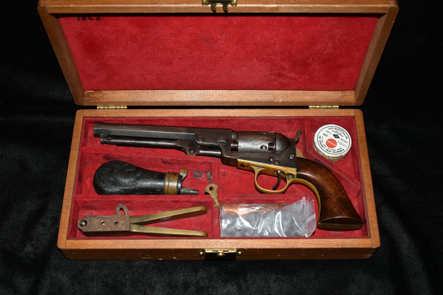 Cased Civil War 1849 Pocket Colt Revolver. SN dates to 1863. Included a wood case, powder flask, bullet mold, cap tin and bullets. 31 gauge. In good as found condition