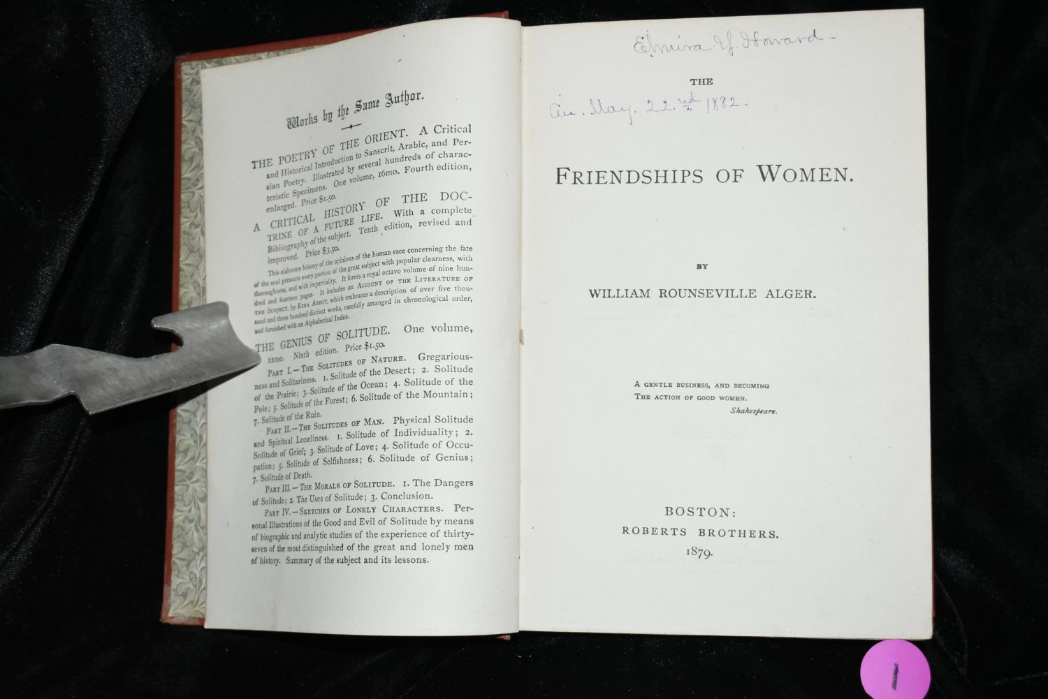 The Friendships of Women 1879 by William Rounseville Alger. Published by Boston: Roberts and Brothers 1879. Nine of Sainte-Beuve’s essays on individual women. Red Cloth with Golt Gilt. Antique Vintage book in very good condition. 7" by 5".