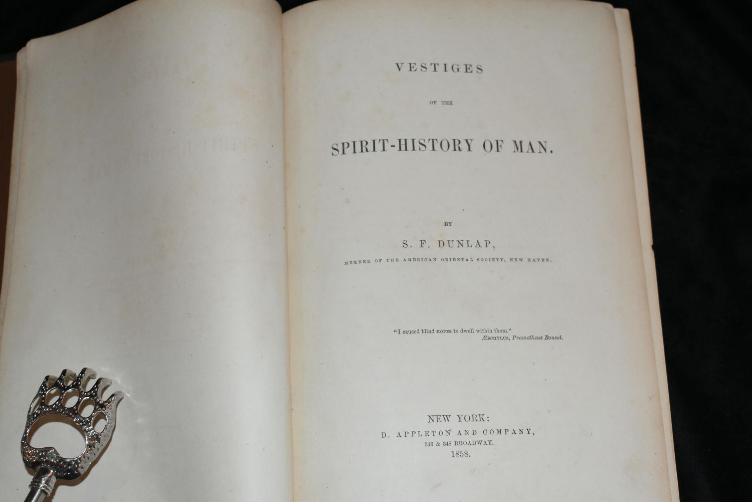 VESTIGES of the SPIRIT HISTORY OF MAN 1858 by S. F. Dunlap. D. Appleton and Company New York, 401 Pgs, 1858. Cloth. First Edition. The author was member of the American Oriental Society, New Haven. Chapter: Spirits, Great Gods, Sun-worship, Fire-worship, Light, Cosmogony, Philosophy, The Logos, The Only-Begotten and The King, Genesis and Exodus, The Garden, Polytheism, Brahmanism and Buddhism, The World Religions. This piece of history is in good condition for its age but lacking its spine. Some foxing throughout the book. 9 1/2" by 6 1/4"