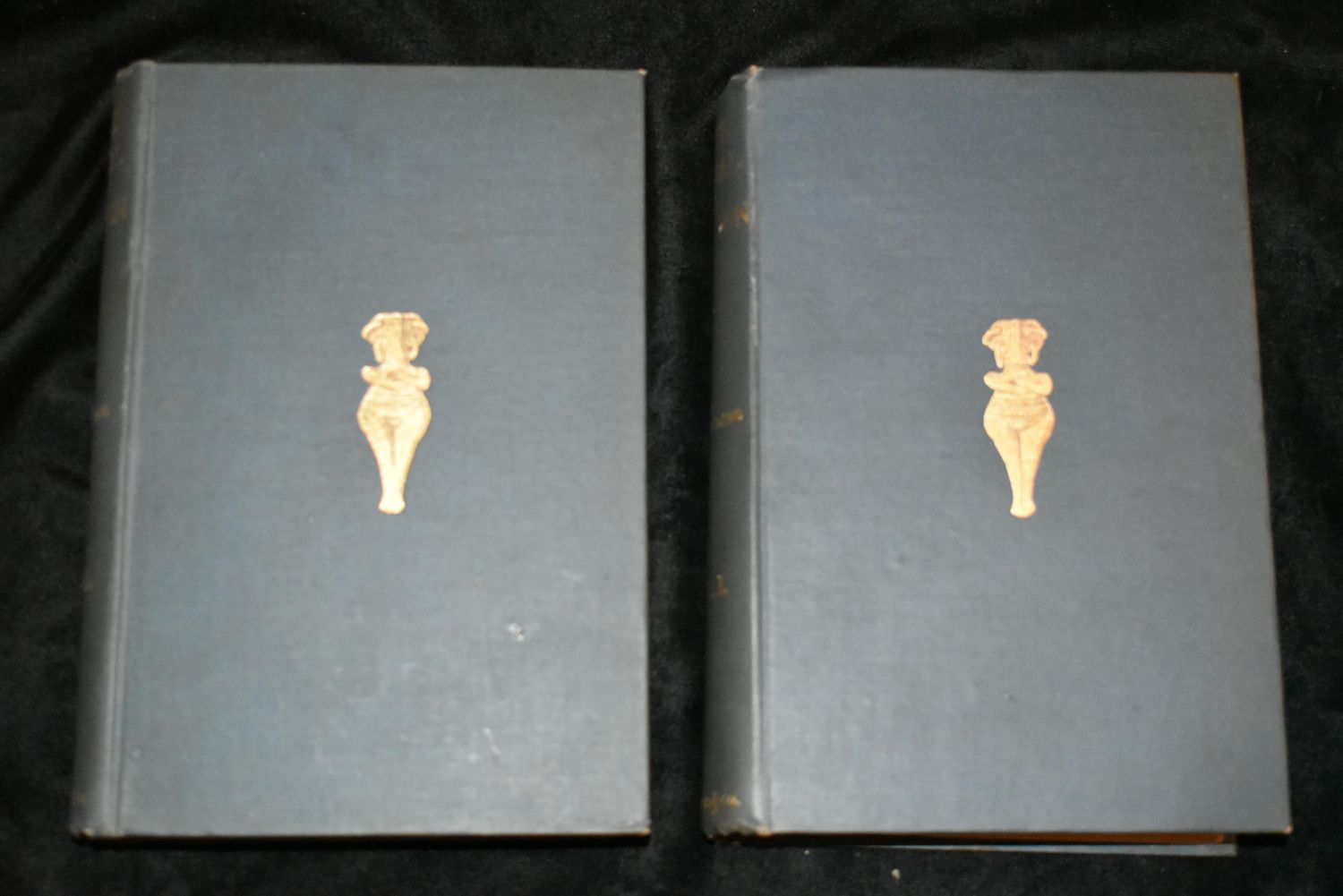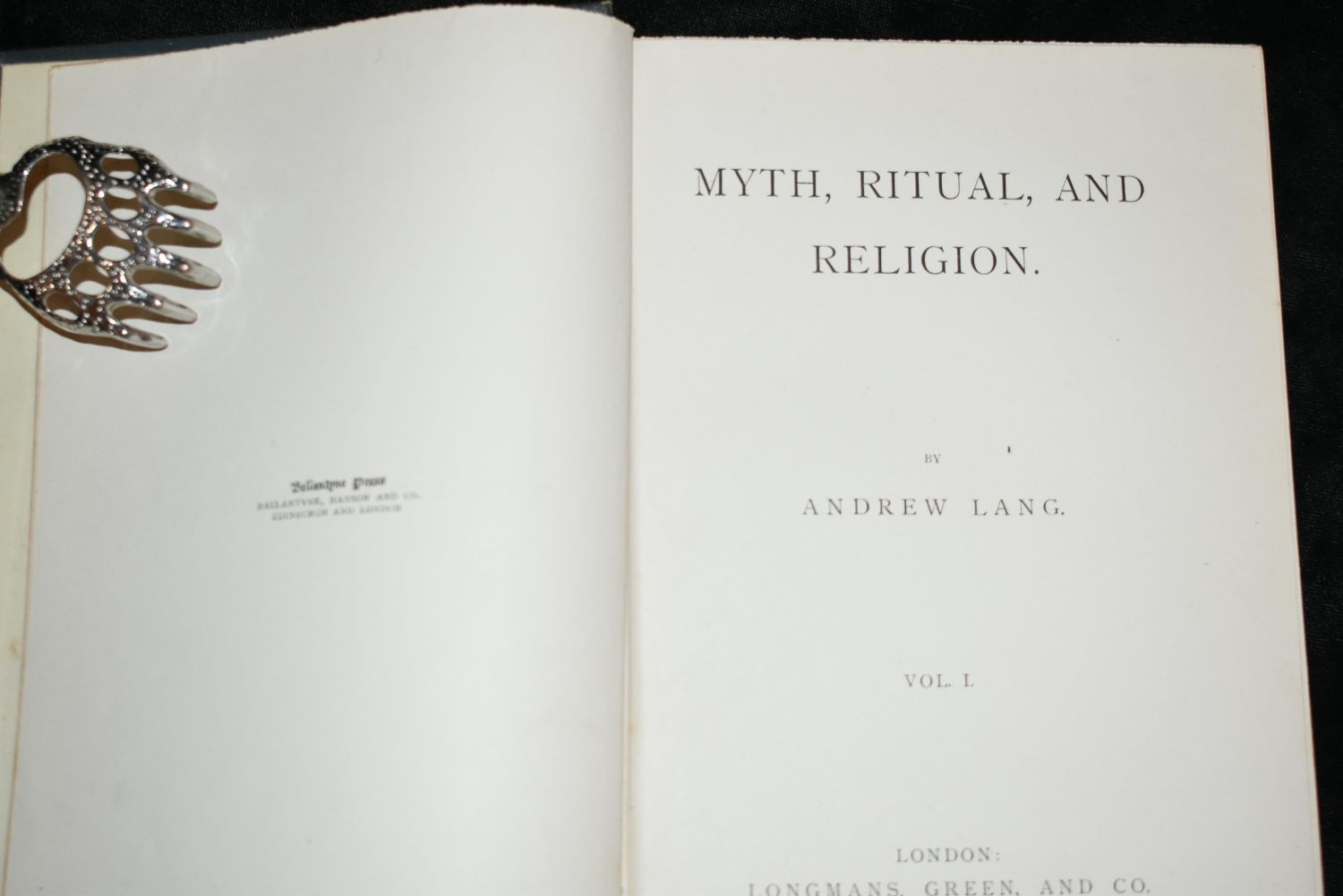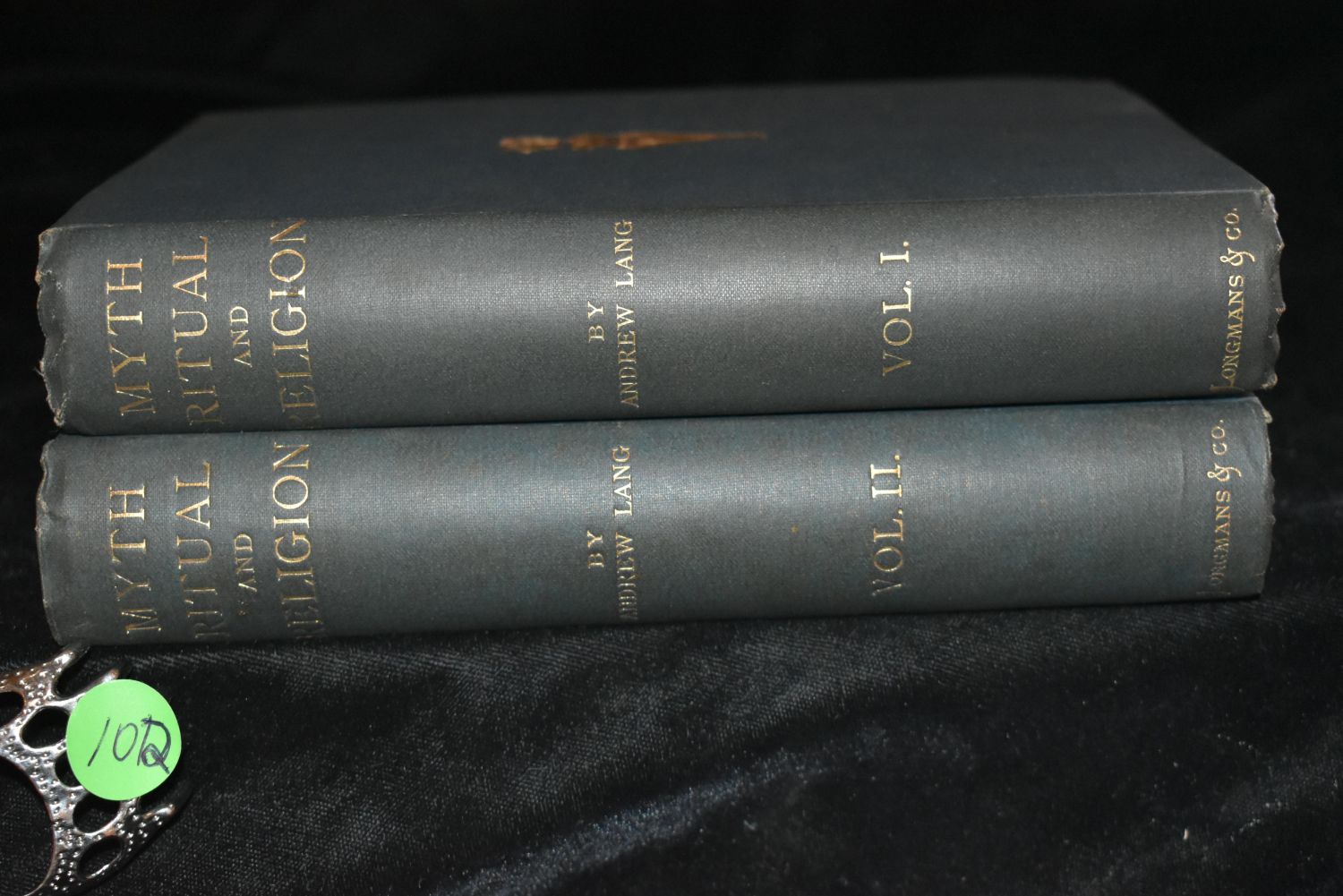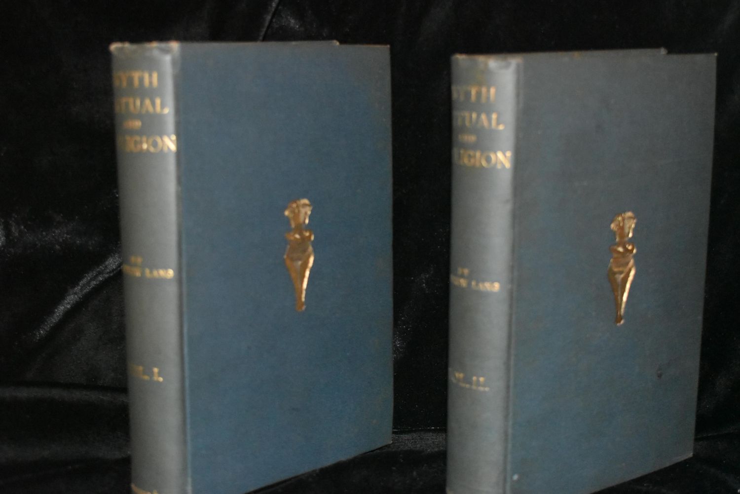 MYTH, RITUAL, and RELIGION 1887 by Andrew Lang. Published by London: Longmans, Green, & Co. (1887) First Edition. Volumes 1 and 2 in excellent condition. Blue Cloth with Gold Gilt. Contents include: Systems of Mythology The Mental condition of savages – Confusion with Nature- Totemism; Magic Metamorphosis – Metaphysics – Psychology; Nature Myths; Non-Aryan myths of the origins of the world and man; Indo-Aryan Myths; Indian myths of the origin of the world and of man; Greek Myths of the Origin of the World and Man; Gods and the Lower races; American divine myths; The mythology of Egypt; Gods of the Aryans of India; Greek divine myths; Heroic and romantic myths. 7 5/8" by 5 1/8".