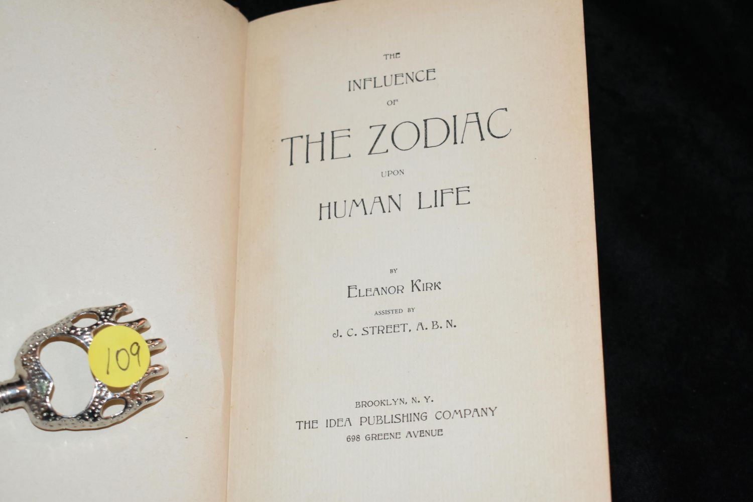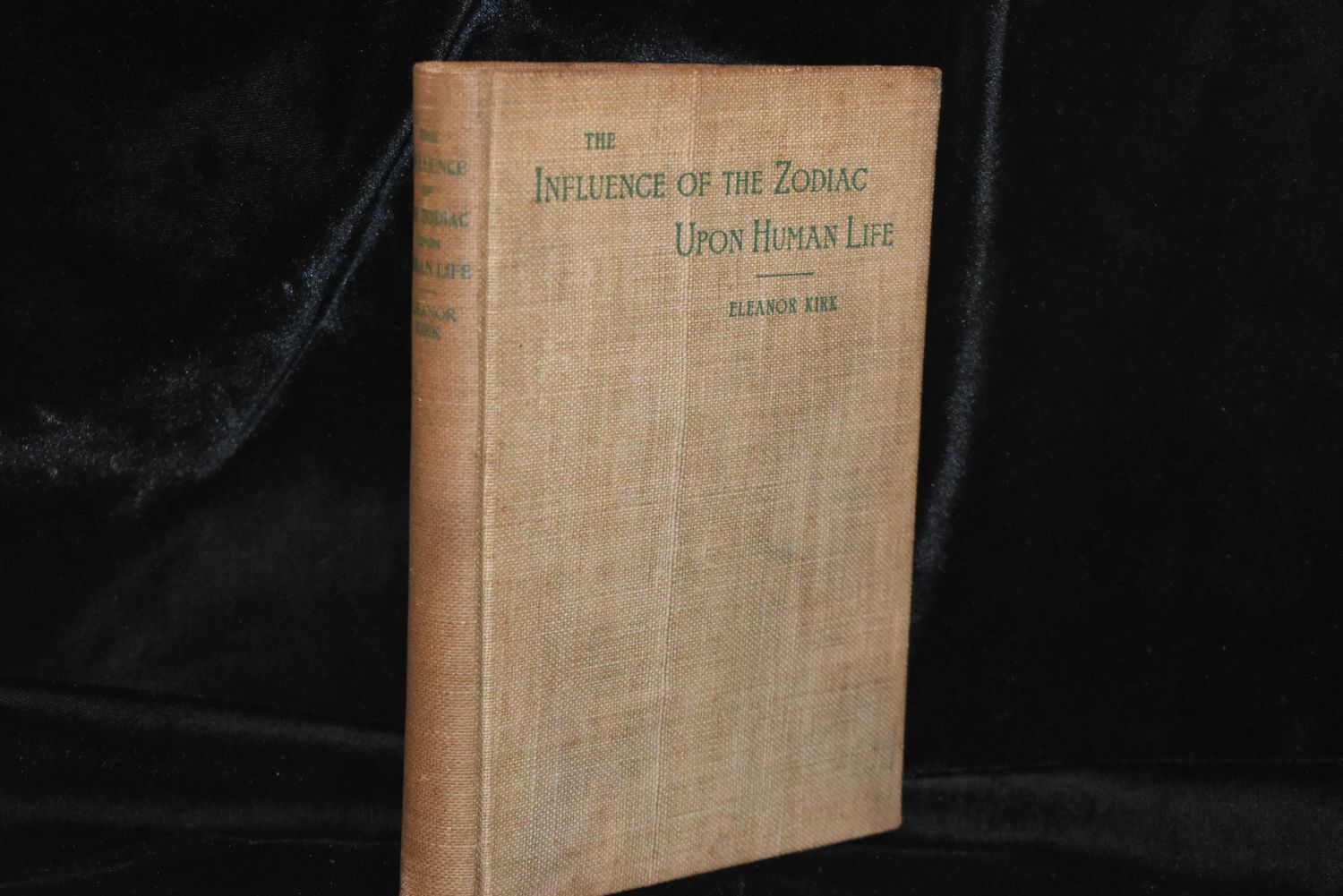 THE INFLUENCE OF THE ZODIAC UPON HUMAN LIFE 1894 by Eleanor Kirk. Presumed 1st Edition. The Idea Publishing Company 1894. Light Brown Cloth Hardback in Good Condition. Very light shelf wear. 180 pgs 7 5/8" by 5 1/8"