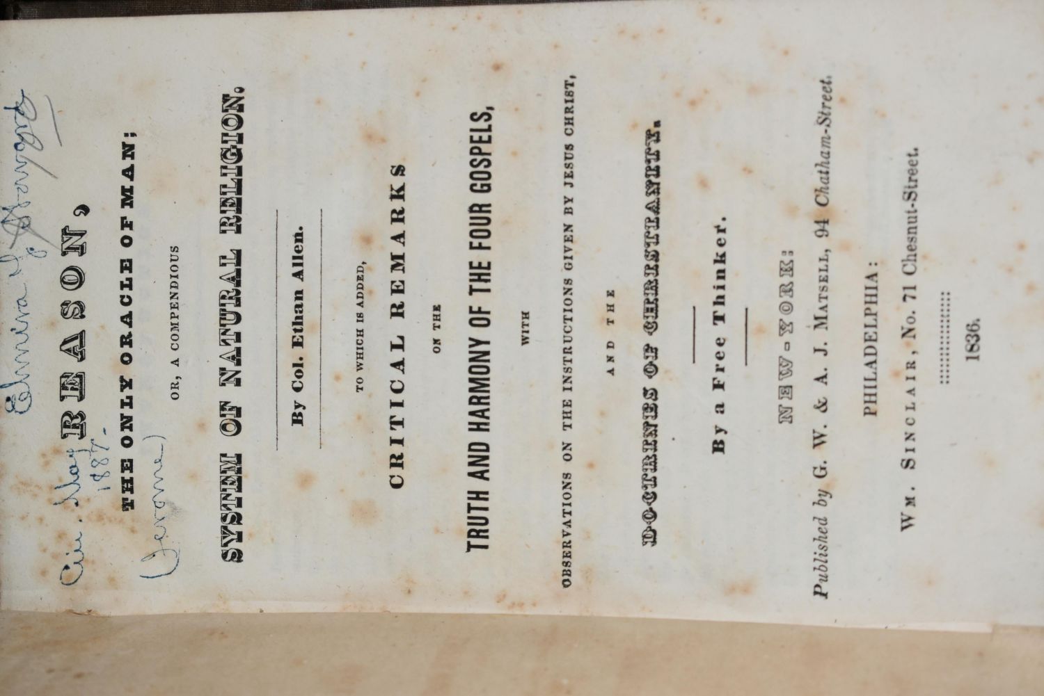 1836 Ethan Allen "Reason, The Only Oracle of Man", or a COMPENDIOUS SYSTEM OF NATURAL RELIGION. Published by G. W. & A. J. Matsell. This book is in fairly good condition for its age. It does have some shelf wear and foxing on pages throughout the book. Hardback with dark brown cloth cover. 7 7/8′ by 4 1/2