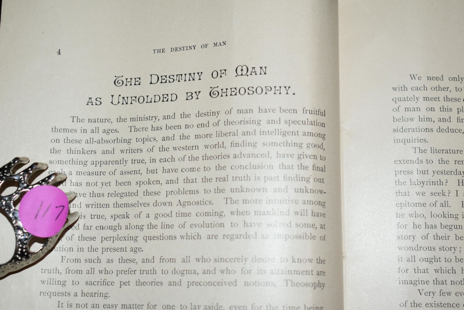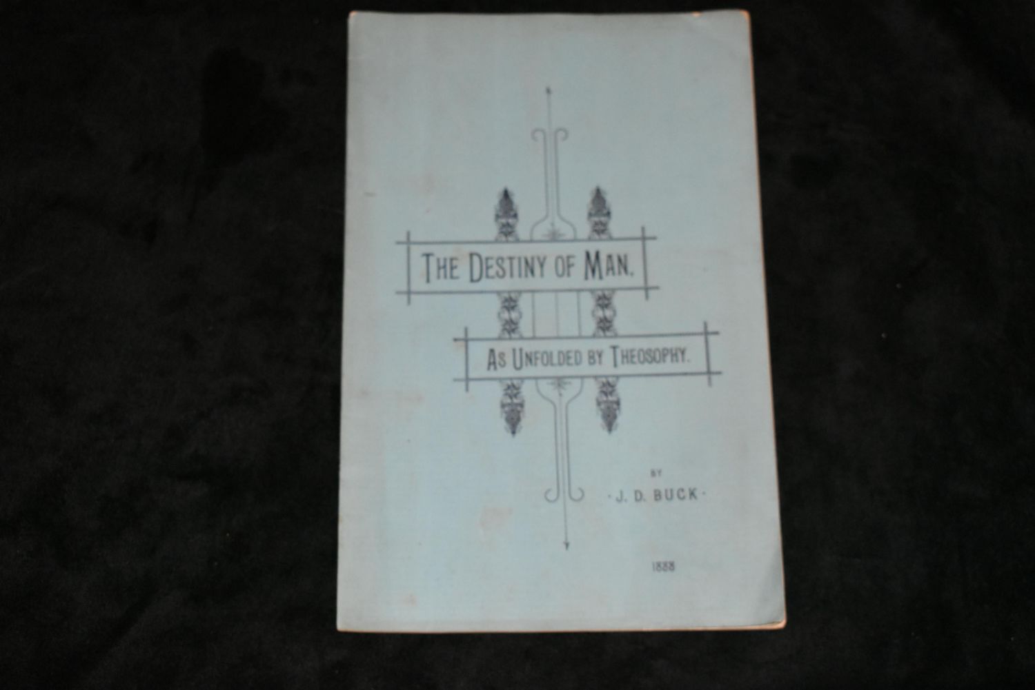 THE DESTINY OF MAN AS UNFOLDED BY THEOSOPHY 1888 by J. D. BUCK. This is an early writing by J. D. Buck which was probably incorporated in to later published works. Paperback in great condition for its age. 17 pgs.. The first owner of most of this book collection knew this author and had many pieces of his literature. Some of which I havnt been able to find a copy of anywhere on the web. 9 1/4" by 6"