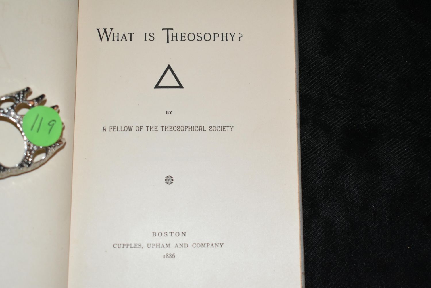 1886 WHAT IS THEOSOPHY? by A Fellow of the THEOSOPHICAL SOCIETY. Published by Cupples, Upham and Company. VERY RARE. In its formation theosophy authors preferred to stay anonymous for obvious reasons of the time. Thin bendable hard back. This little book is in very good condition with exception of some blotches on the cover. 28 Pages. 7" by 5 1/8"