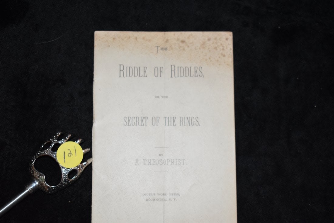 THE RIDDLE OF RIDDLES or the Secret of the Rings by a Theosophist. Published by Occult World Press, Rochester N.Y.. A Short 14 page paperback pamphlet most likely from the mid 1880’s. This was the first place I noticed the words Occult and Theosophist on the same page. It has some foxing on the cover but in good shape otherwise. 5 3/4" by 4"