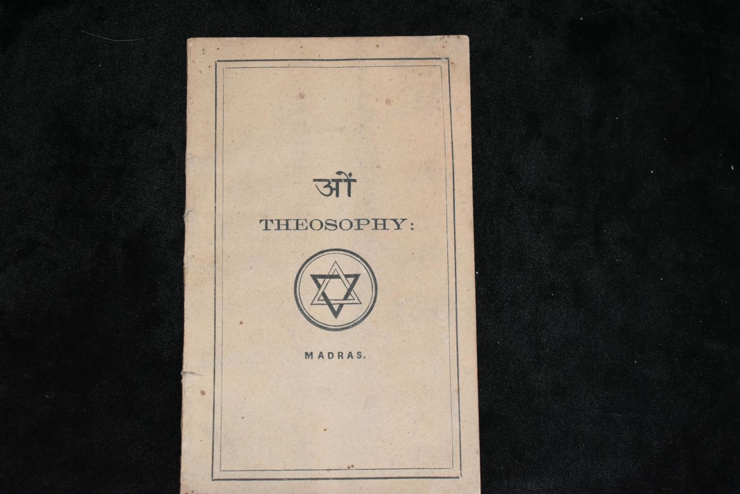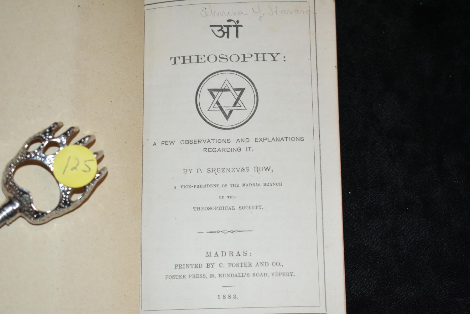 THEOSOPHY 1883 by P. Sreenevas Row the vice president of the Theosophical Society. A Few Observations and Explanations regarding it. Printed by C. Foster and Company. Paperback 47 Pages in Good condition with some age spots on the cover. 6 7/8" by 4 1/8"