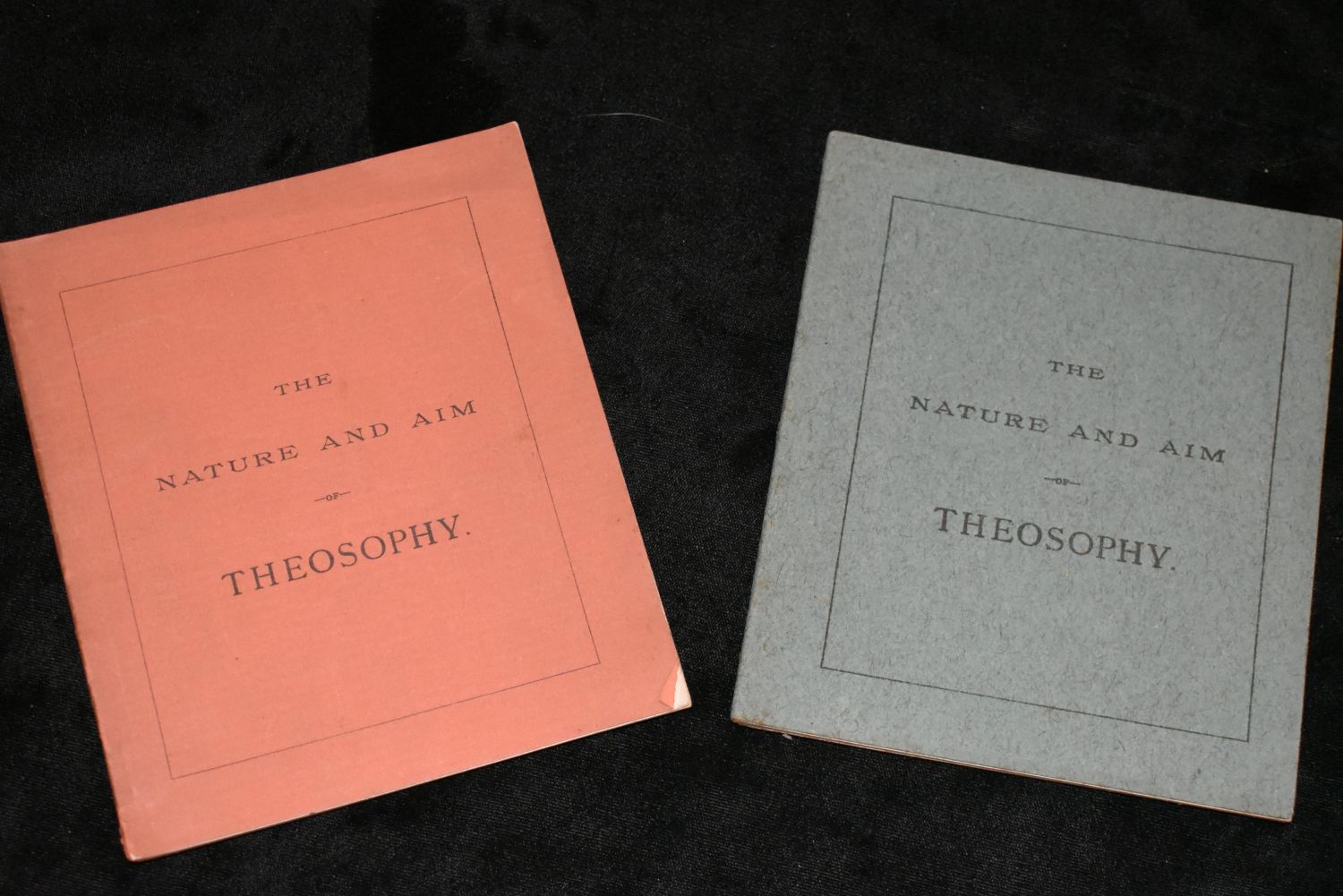 1886 The Nature and Aim of Theosophy x2 by J. D. Buck. An Essay Read before the Cincinnati Literary Club January 17, 1886. Both are identical except for their cover color. Paperbacks in Good Condition. 5 7/8" by 5".