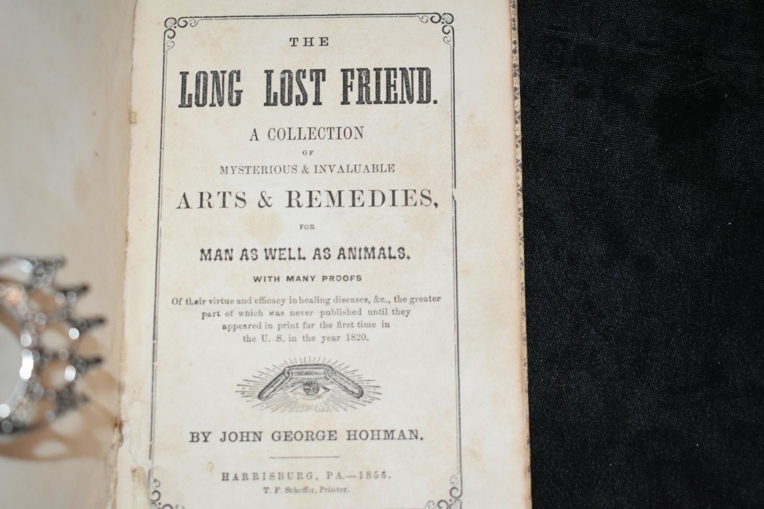 1856 LONG LOST FRIEND ARTS AND REMEDIES by John Hohman. THE LONG LOST FRIEND A COLLECTION OF MYSTERIOUS & INVALUABLE ARTS AND REMEDIES, FOR MAN AS WELL AS ANIMALS. Book is in fair condition. Cover is thin cardboard and seems like it got sat in a back pocket or something. Its slightly warped. Still readable and all there. Short tare to 1st 2 pages in bottom next to binding. Still a Cool Little book. 72 pgs 7" by 4 1/2"