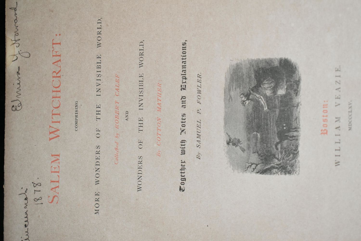 1865 SALEM WITCHCRAFT by SAMUEL P. FOWLER SALEM WITCHCRAFT comprising More Wonders of the Invisible World (Robert Calif) and Wonders of the Invisible World (Cotton Mather) Boston: William Veazie, 1865. One of 250 copies printed. Pebbled cloth. Its all there and still bound but it looks like Satin himself got hold of it. Ill say its Fair only because the pages are all there and readable. The Cover is in bad shape. It looks like moisture hit the outside of the book at some time. Just enough to make it look like that book off of the Evil Dead Movie. It is an extremely rare book just be forewarned if you buy it its nowhere near perfect! Could be cursed too….. 9" by 6 7/8"